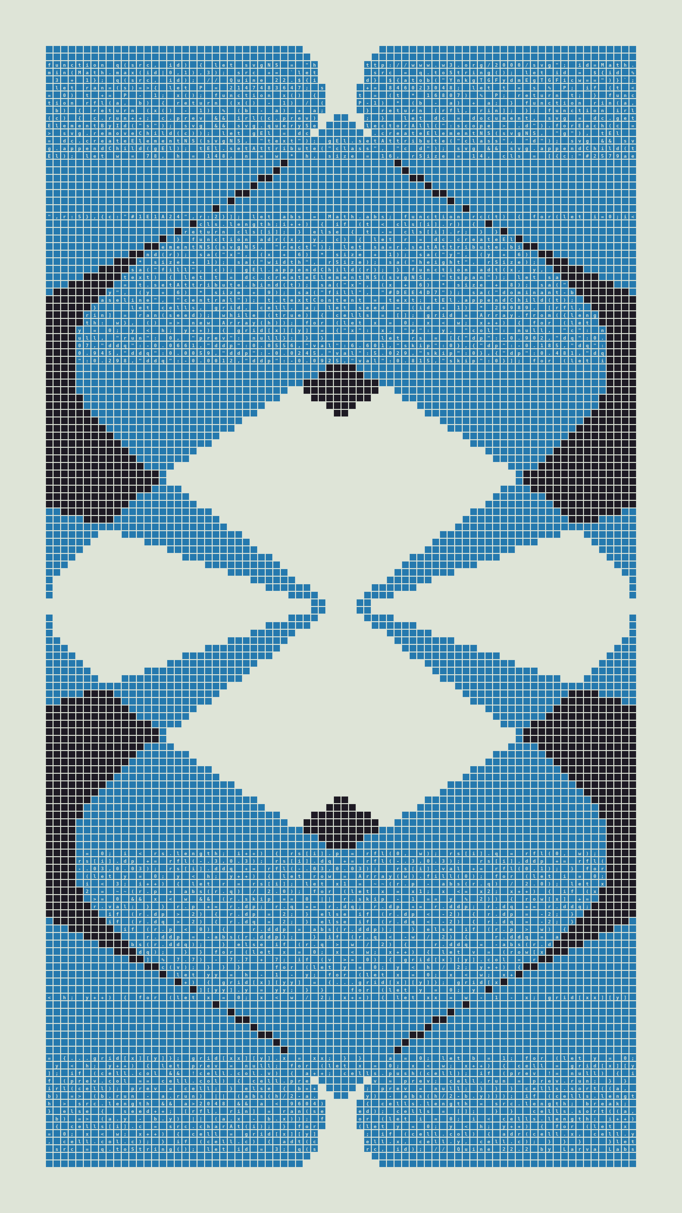 As opposed to creating the artwork directly, the main generator constructs a much smaller, specialized program that produces the visual output, including a layout of its own source code into the work, as well as the mechanism to reproduce itself. In this way, Quines are both program listings and artworks.