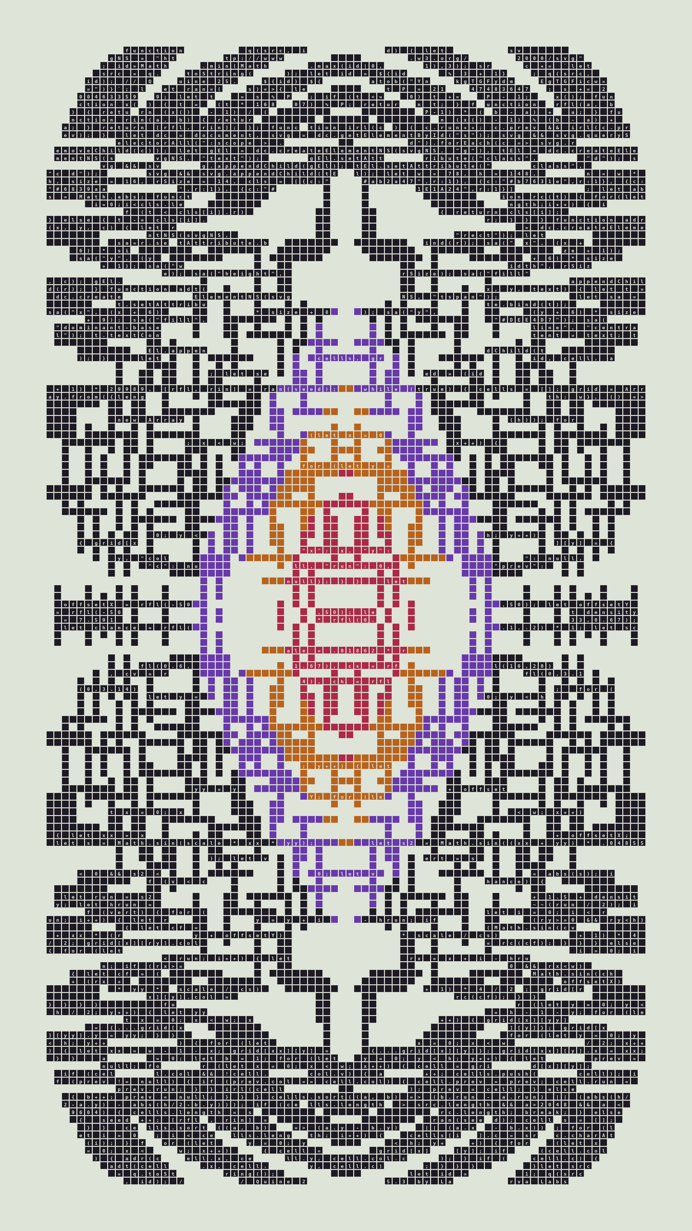 As opposed to creating the artwork directly, the main generator constructs a much smaller, specialized program that produces the visual output, including a layout of its own source code into the work, as well as the mechanism to reproduce itself. In this way, Quines are both program listings and artworks.