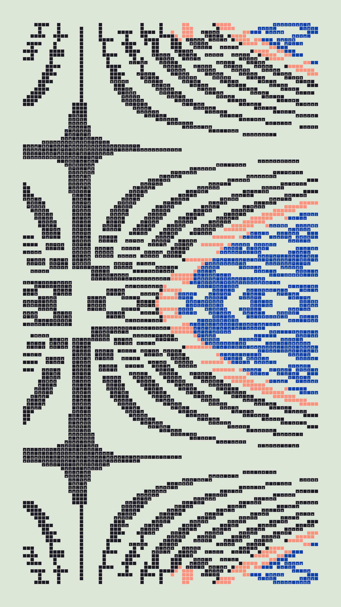 Quine is Larva Labs' contribution to the final Art Blocks Curated series, a project that underscores that all the works on the Art Blocks platform are generated directly from code with no artist supervision. Drawing from the computer science concept of a quine (a computer program that produces a copy of its own source code as its output), the work incorporates its own code into the visuals it creates.