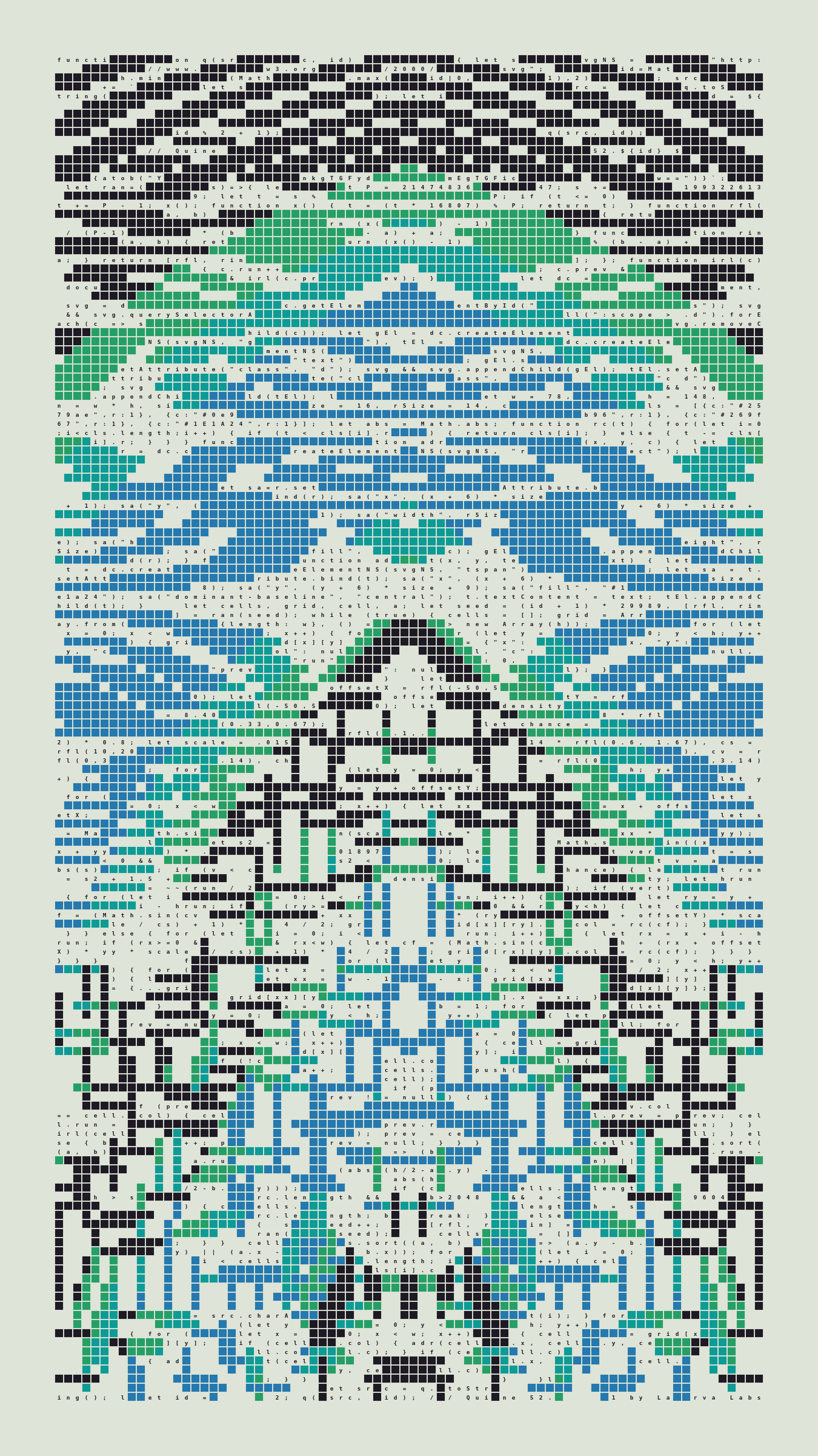 As opposed to creating the artwork directly, the main generator constructs a much smaller, specialized program that produces the visual output, including a layout of its own source code into the work, as well as the mechanism to reproduce itself. In this way, Quines are both program listings and artworks.