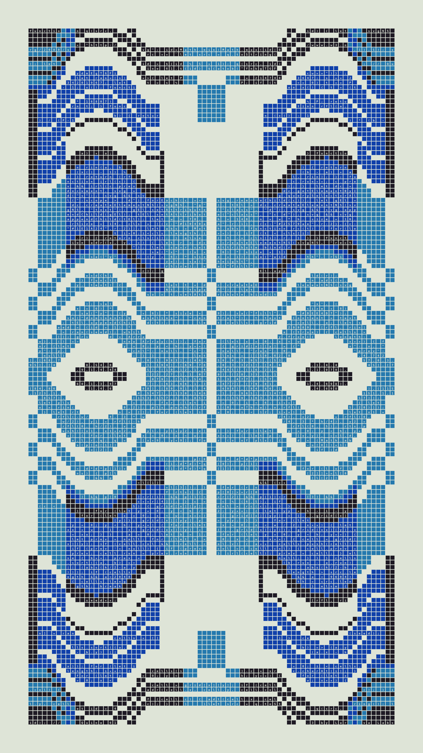 Quine is Larva Labs' contribution to the final Art Blocks Curated series, a project that underscores that all the works on the Art Blocks platform are generated directly from code with no artist supervision. Drawing from the computer science concept of a quine (a computer program that produces a copy of its own source code as its output), the work incorporates its own code into the visuals it creates.