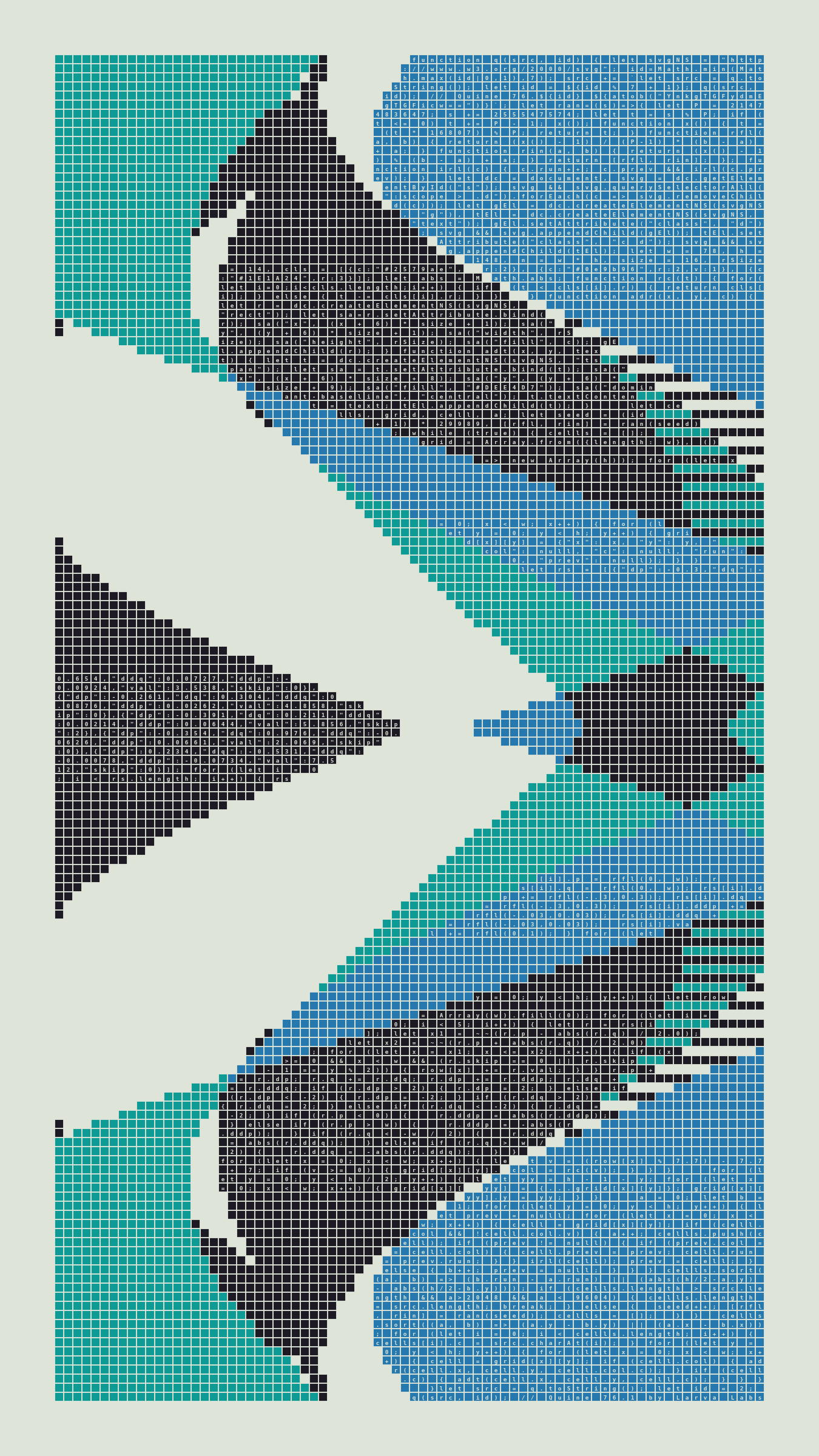 Quine is Larva Labs' contribution to the final Art Blocks Curated series, a project that underscores that all the works on the Art Blocks platform are generated directly from code with no artist supervision. Drawing from the computer science concept of a quine (a computer program that produces a copy of its own source code as its output), the work incorporates its own code into the visuals it creates.