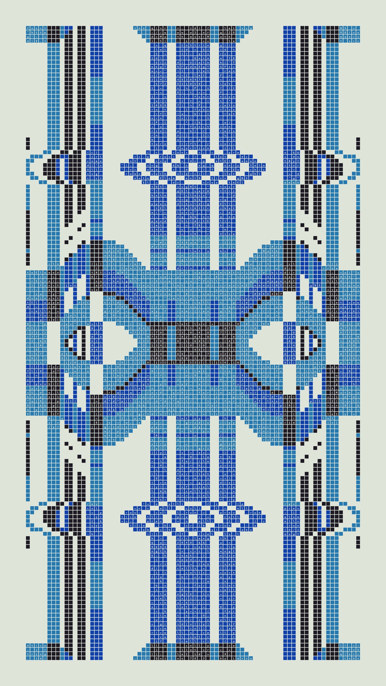 As opposed to creating the artwork directly, the main generator constructs a much smaller, specialized program that produces the visual output, including a layout of its own source code into the work, as well as the mechanism to reproduce itself. In this way, Quines are both program listings and artworks.