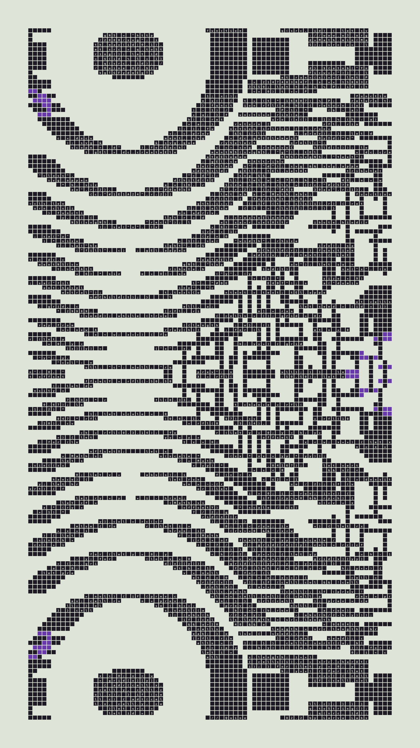 Quine is Larva Labs' contribution to the final Art Blocks Curated series, a project that underscores that all the works on the Art Blocks platform are generated directly from code with no artist supervision. Drawing from the computer science concept of a quine (a computer program that produces a copy of its own source code as its output), the work incorporates its own code into the visuals it creates.