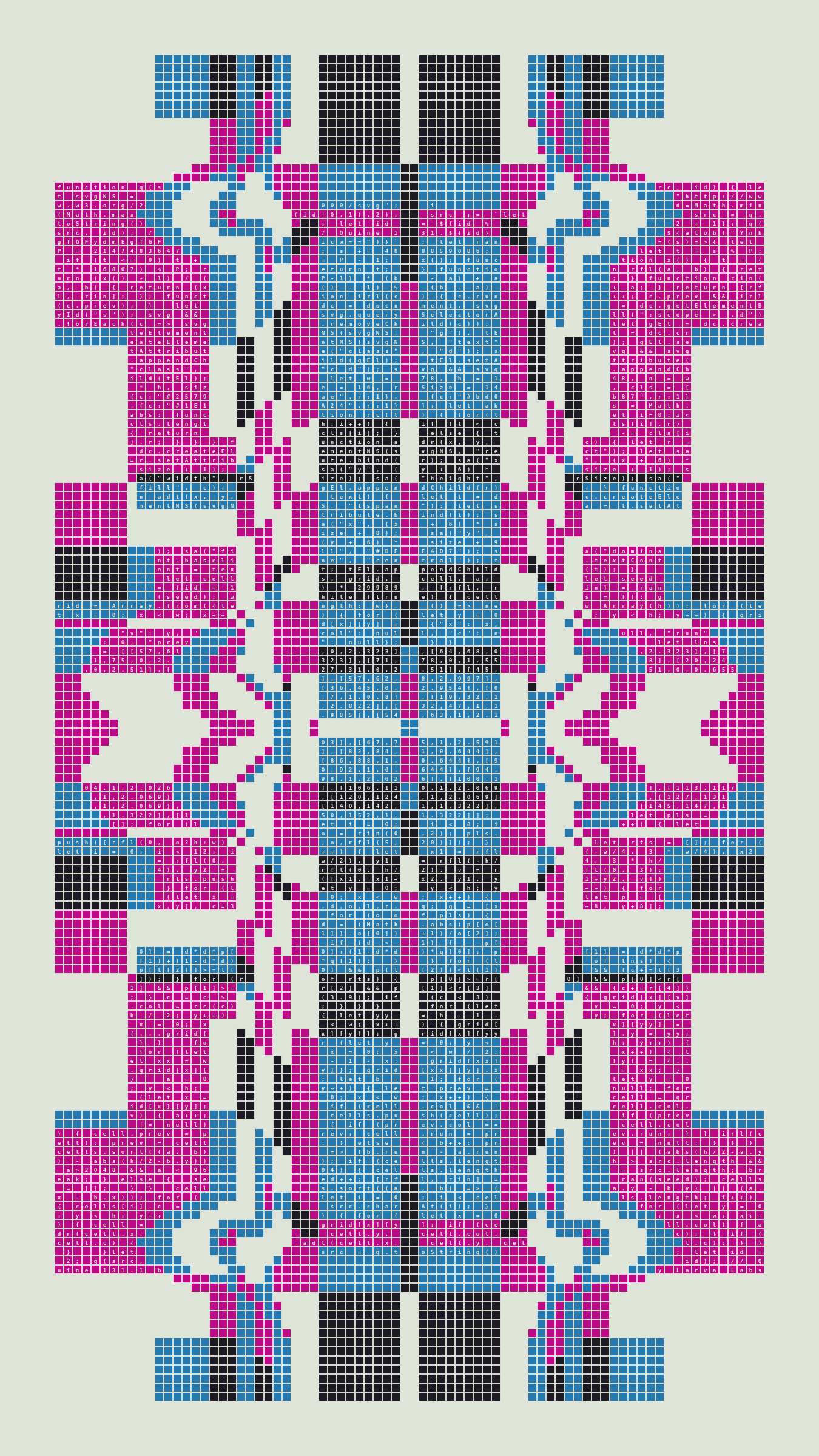 As opposed to creating the artwork directly, the main generator constructs a much smaller, specialized program that produces the visual output, including a layout of its own source code into the work, as well as the mechanism to reproduce itself. In this way, Quines are both program listings and artworks.