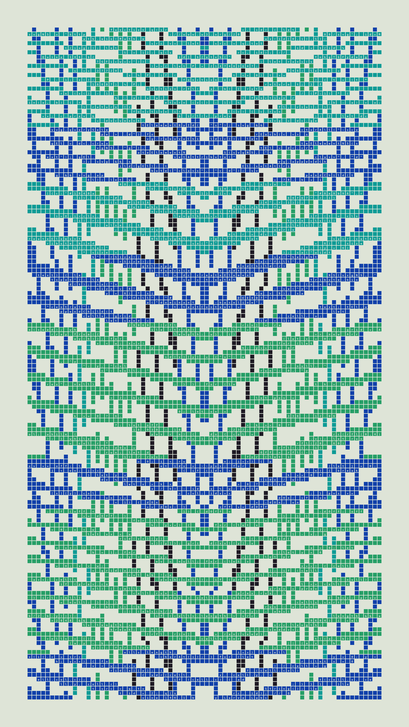 Quine is Larva Labs' contribution to the final Art Blocks Curated series, a project that underscores that all the works on the Art Blocks platform are generated directly from code with no artist supervision. Drawing from the computer science concept of a quine (a computer program that produces a copy of its own source code as its output), the work incorporates its own code into the visuals it creates.