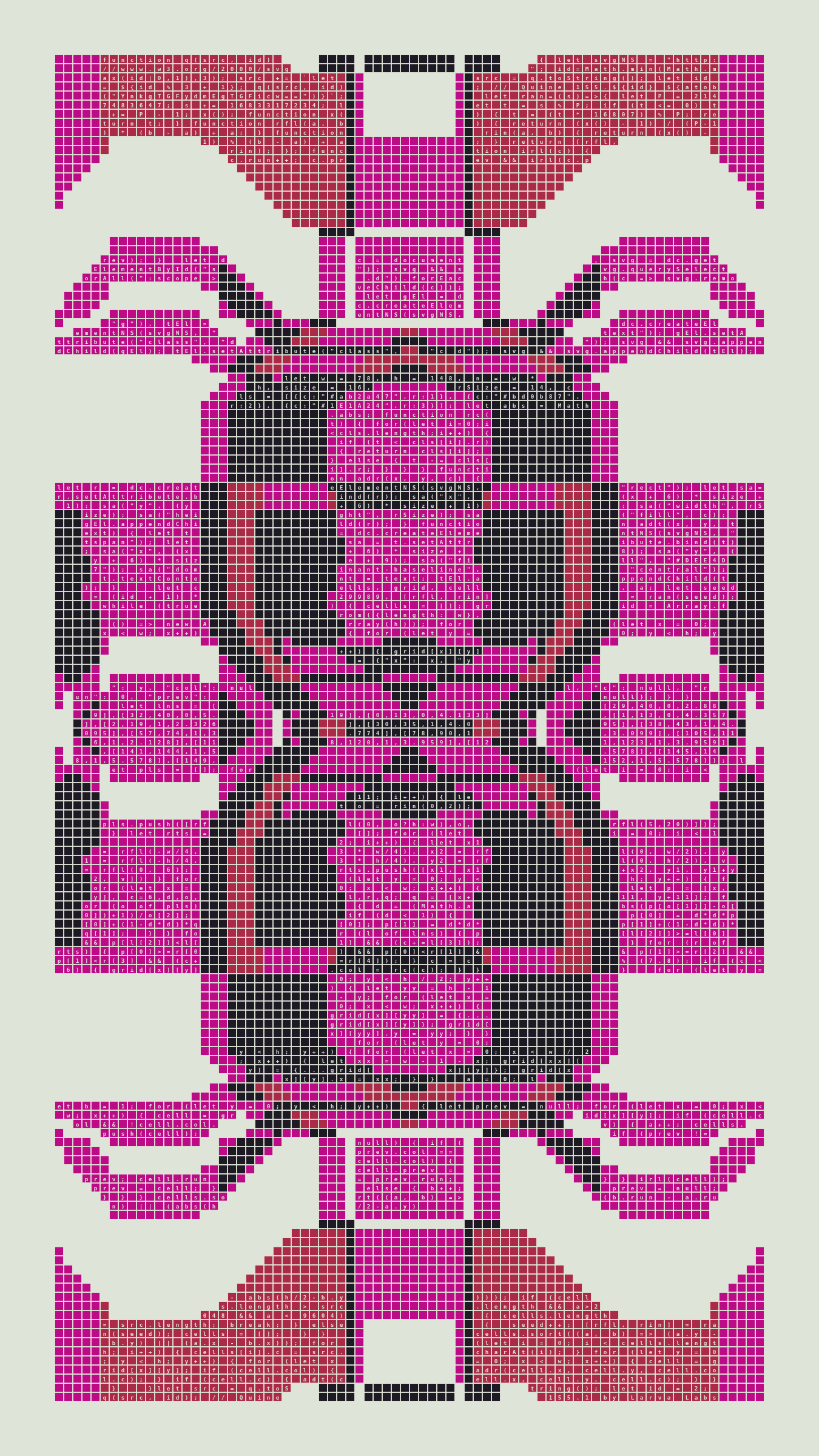 Quine is Larva Labs' contribution to the final Art Blocks Curated series, a project that underscores that all the works on the Art Blocks platform are generated directly from code with no artist supervision. Drawing from the computer science concept of a quine (a computer program that produces a copy of its own source code as its output), the work incorporates its own code into the visuals it creates.
