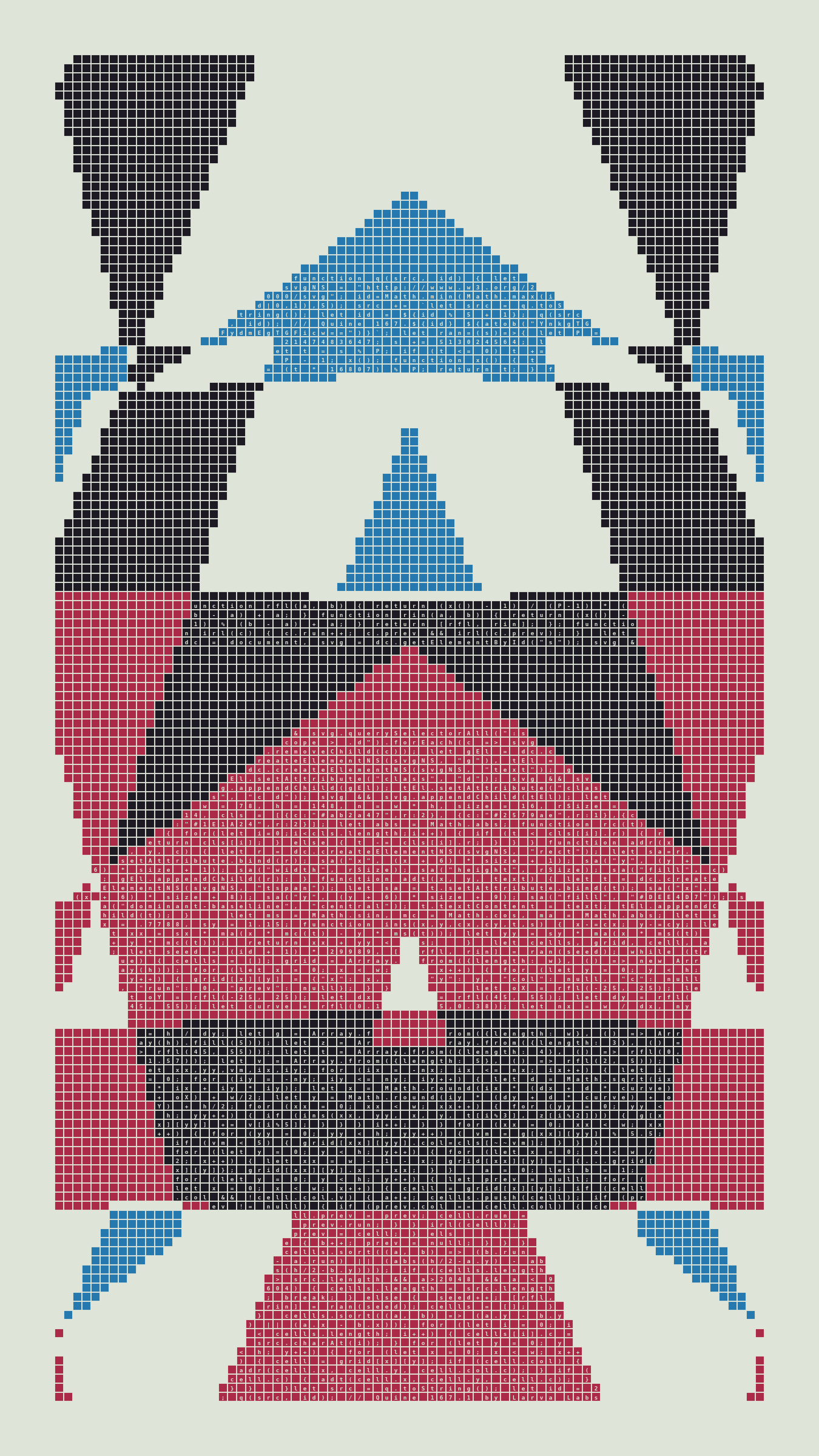 As opposed to creating the artwork directly, the main generator constructs a much smaller, specialized program that produces the visual output, including a layout of its own source code into the work, as well as the mechanism to reproduce itself. In this way, Quines are both program listings and artworks.