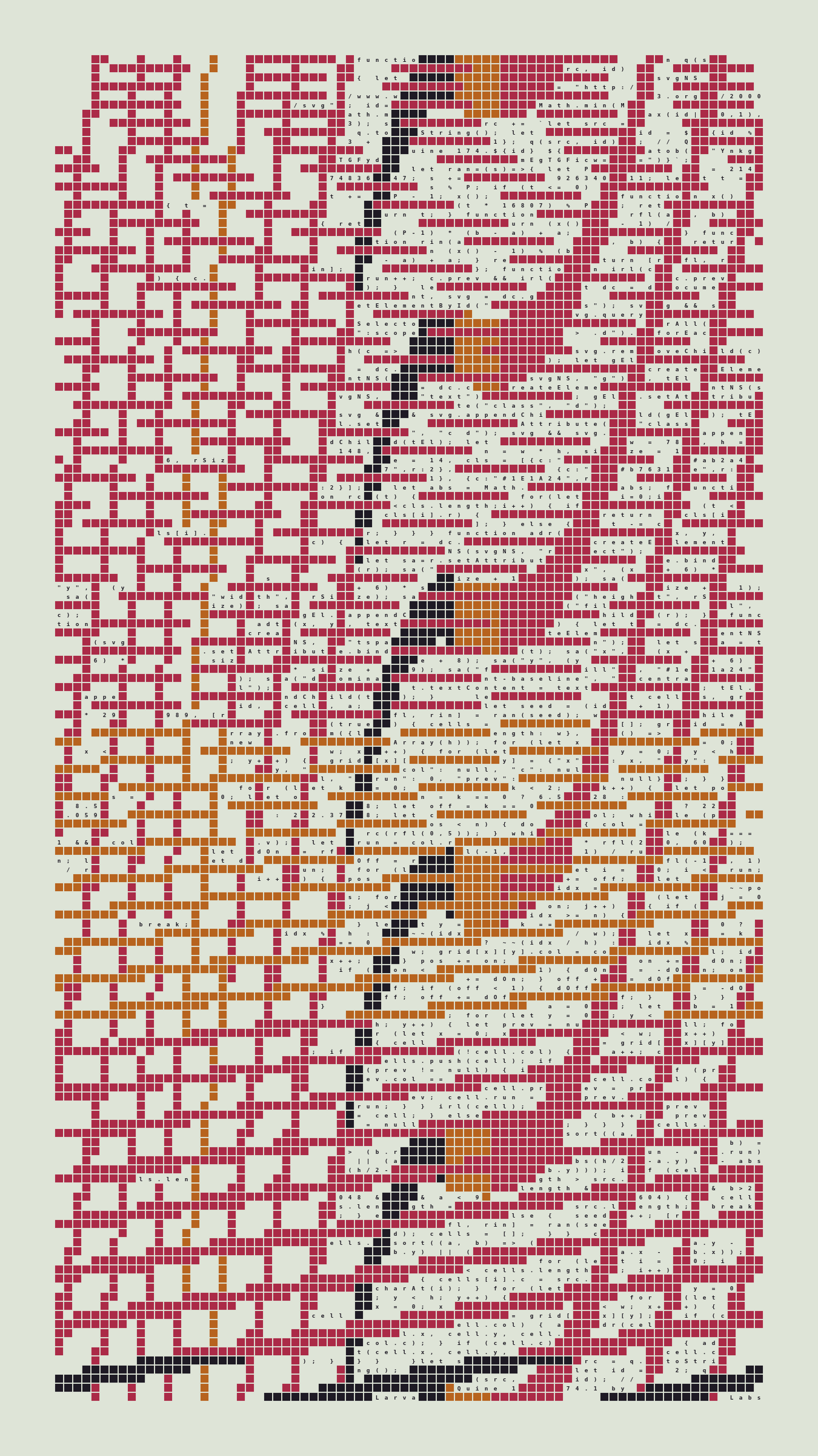 Quine is Larva Labs' contribution to the final Art Blocks Curated series, a project that underscores that all the works on the Art Blocks platform are generated directly from code with no artist supervision. Drawing from the computer science concept of a quine (a computer program that produces a copy of its own source code as its output), the work incorporates its own code into the visuals it creates.