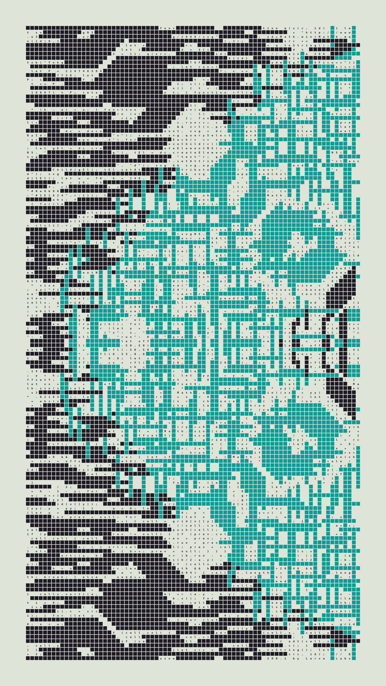As opposed to creating the artwork directly, the main generator constructs a much smaller, specialized program that produces the visual output, including a layout of its own source code into the work, as well as the mechanism to reproduce itself. In this way, Quines are both program listings and artworks.