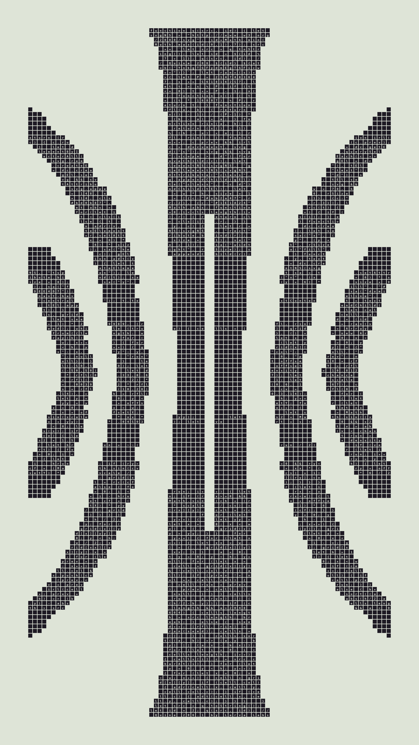 Quine is Larva Labs' contribution to the final Art Blocks Curated series, a project that underscores that all the works on the Art Blocks platform are generated directly from code with no artist supervision. Drawing from the computer science concept of a quine (a computer program that produces a copy of its own source code as its output), the work incorporates its own code into the visuals it creates.