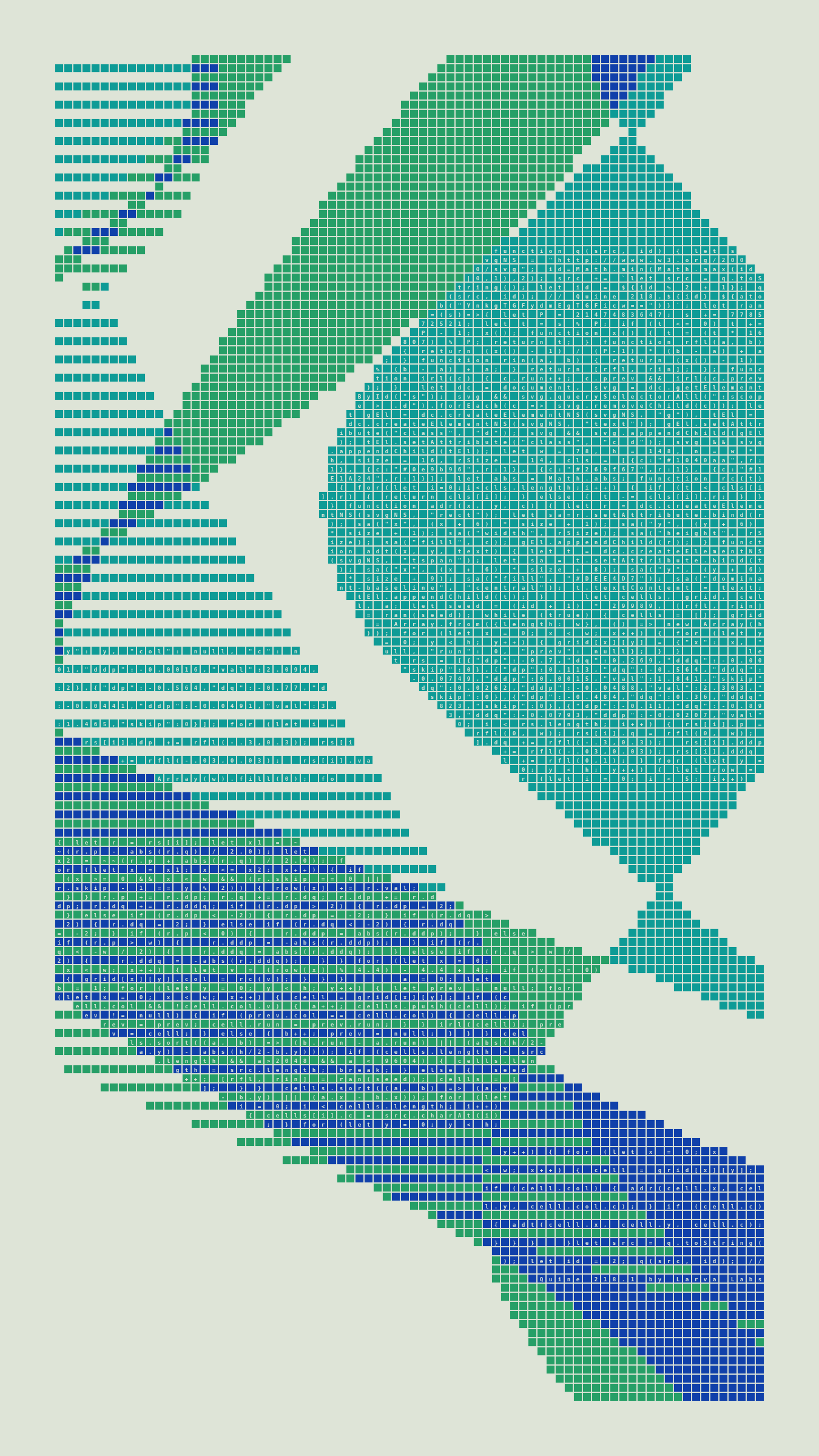 Quine is Larva Labs' contribution to the final Art Blocks Curated series, a project that underscores that all the works on the Art Blocks platform are generated directly from code with no artist supervision. Drawing from the computer science concept of a quine (a computer program that produces a copy of its own source code as its output), the work incorporates its own code into the visuals it creates.