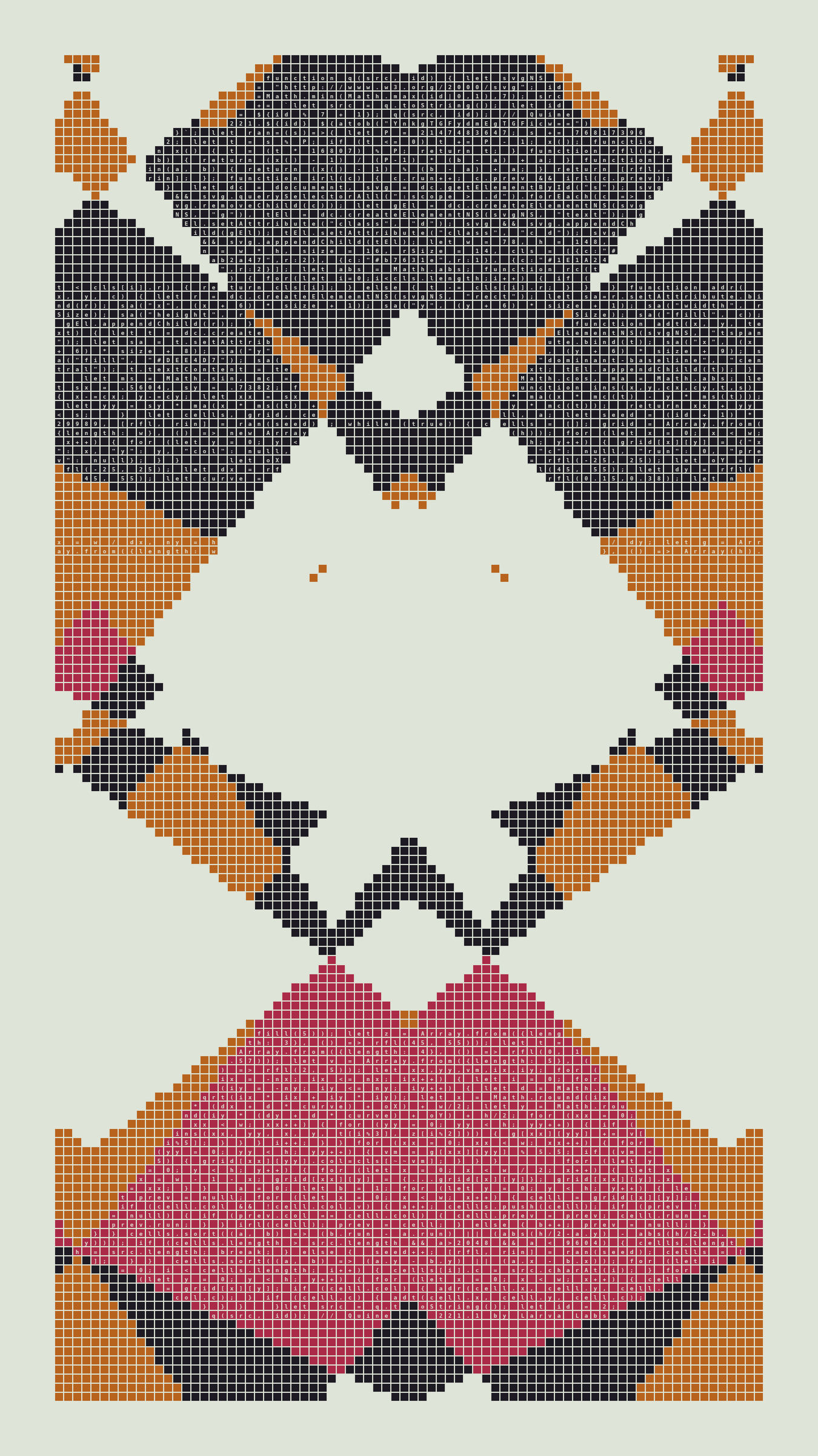 Quine is Larva Labs' contribution to the final Art Blocks Curated series, a project that underscores that all the works on the Art Blocks platform are generated directly from code with no artist supervision. Drawing from the computer science concept of a quine (a computer program that produces a copy of its own source code as its output), the work incorporates its own code into the visuals it creates.