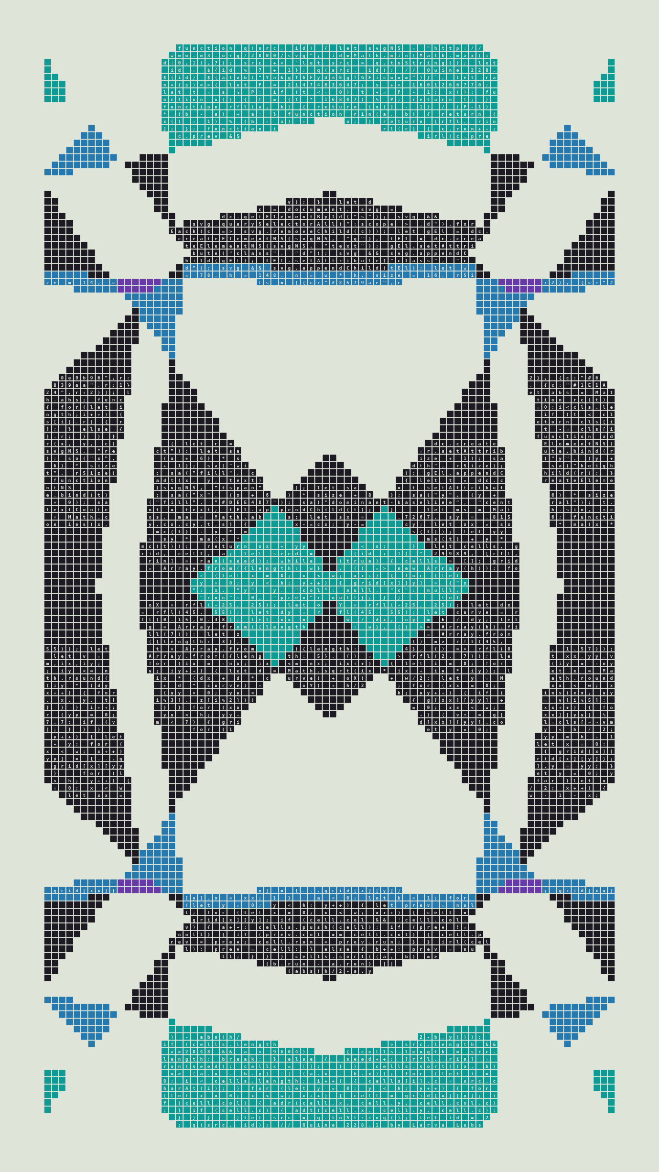 Quine is Larva Labs' contribution to the final Art Blocks Curated series, a project that underscores that all the works on the Art Blocks platform are generated directly from code with no artist supervision. Drawing from the computer science concept of a quine (a computer program that produces a copy of its own source code as its output), the work incorporates its own code into the visuals it creates.