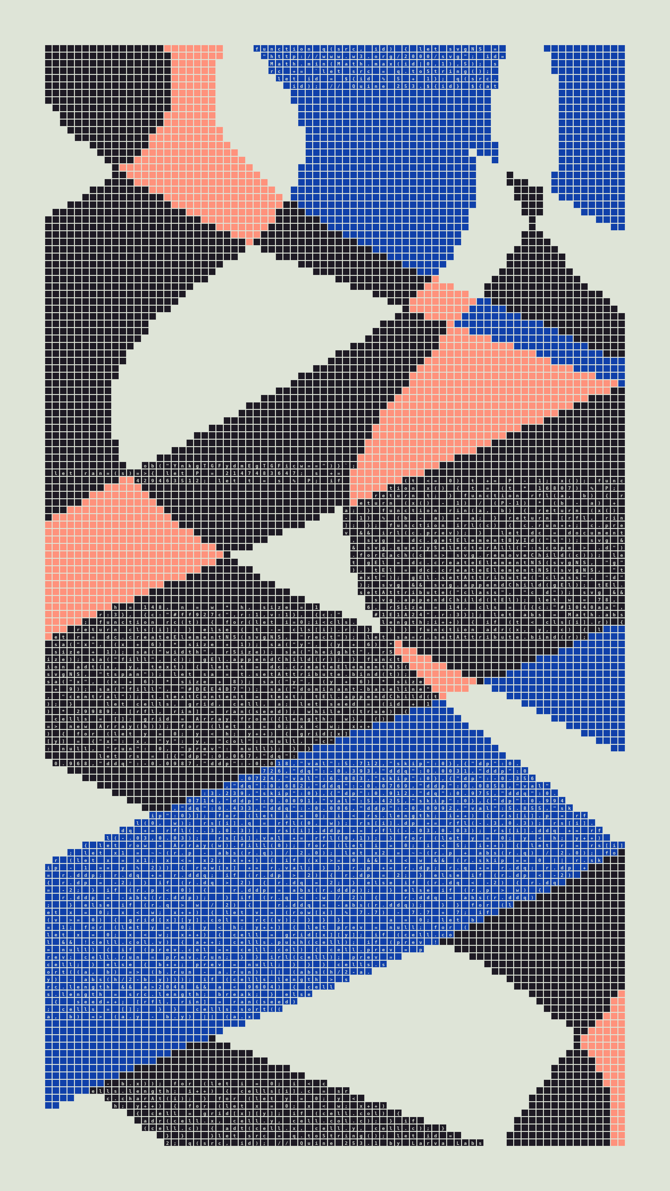 Quine is Larva Labs' contribution to the final Art Blocks Curated series, a project that underscores that all the works on the Art Blocks platform are generated directly from code with no artist supervision. Drawing from the computer science concept of a quine (a computer program that produces a copy of its own source code as its output), the work incorporates its own code into the visuals it creates.