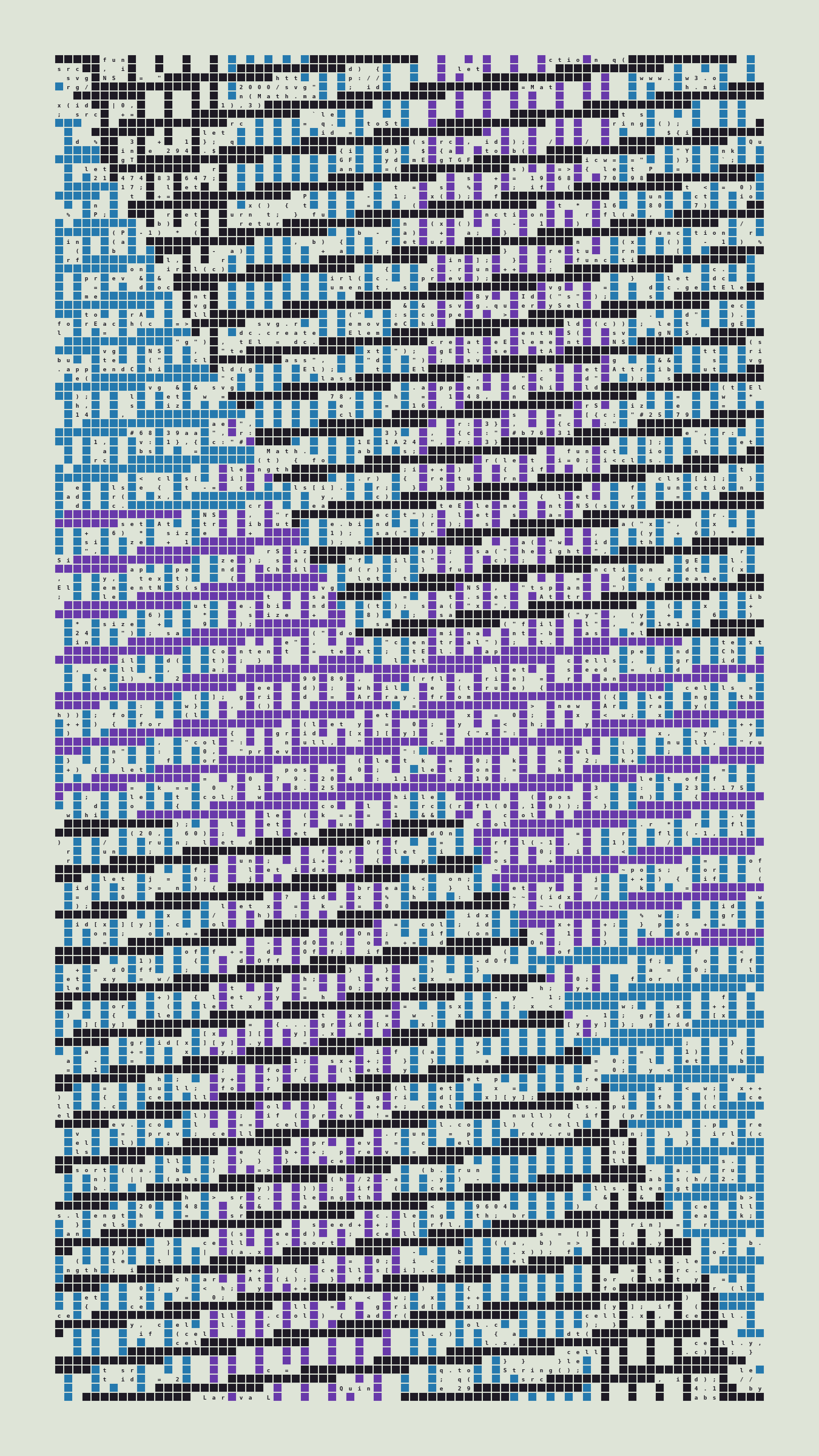 As opposed to creating the artwork directly, the main generator constructs a much smaller, specialized program that produces the visual output, including a layout of its own source code into the work, as well as the mechanism to reproduce itself. In this way, Quines are both program listings and artworks.