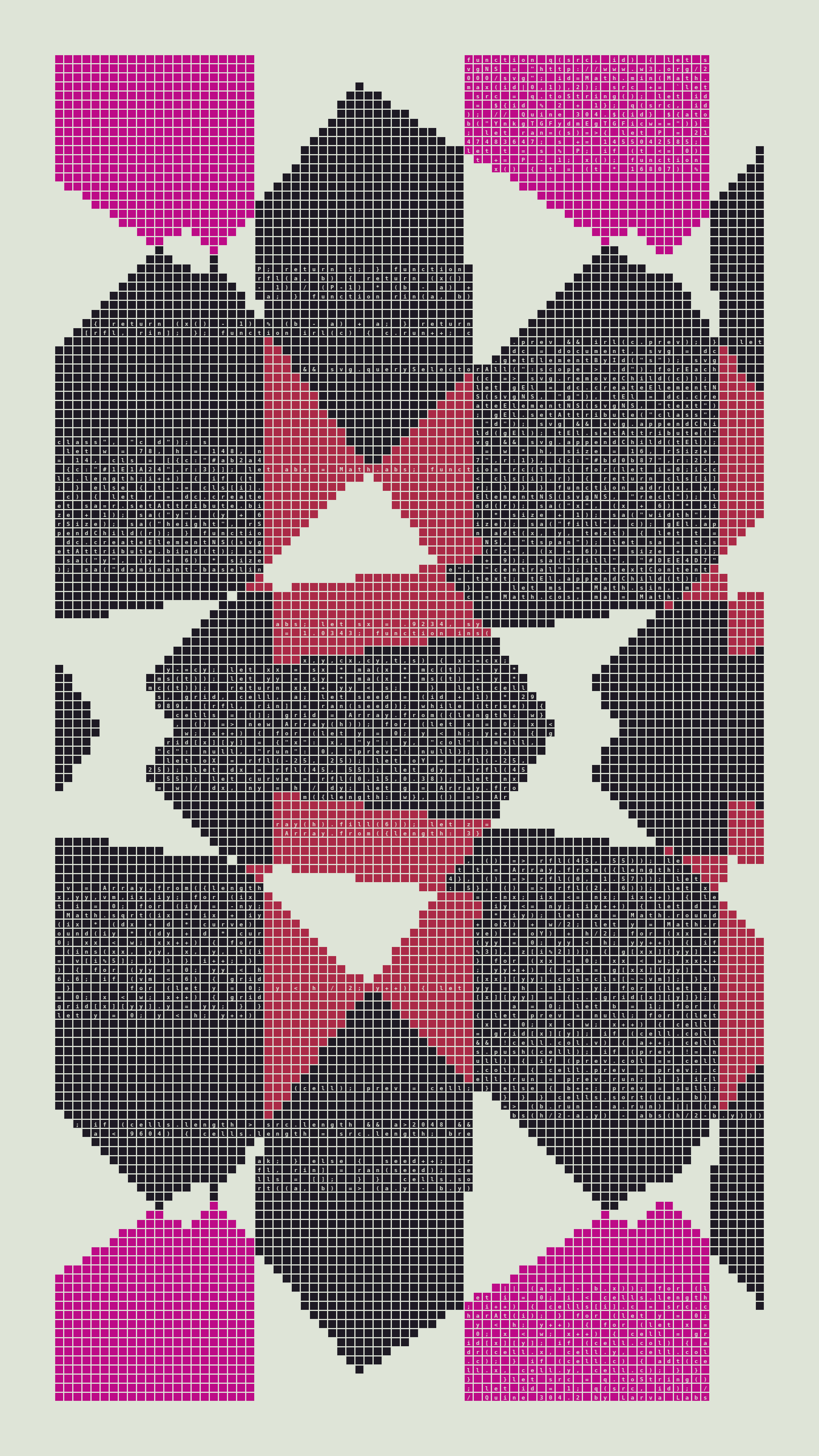 Quine is Larva Labs' contribution to the final Art Blocks Curated series, a project that underscores that all the works on the Art Blocks platform are generated directly from code with no artist supervision. Drawing from the computer science concept of a quine (a computer program that produces a copy of its own source code as its output), the work incorporates its own code into the visuals it creates.