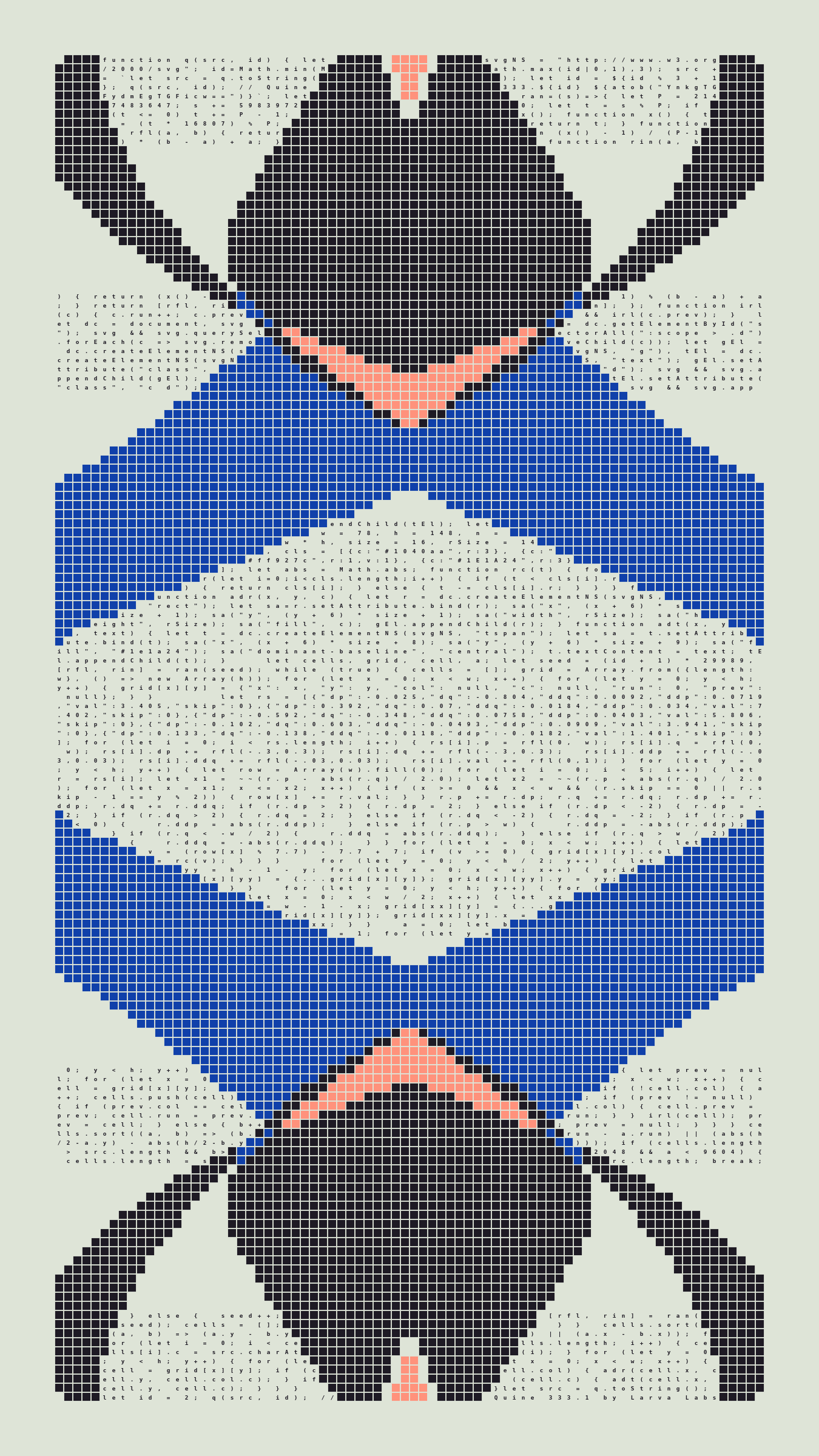 Quine is Larva Labs' contribution to the final Art Blocks Curated series, a project that underscores that all the works on the Art Blocks platform are generated directly from code with no artist supervision. Drawing from the computer science concept of a quine (a computer program that produces a copy of its own source code as its output), the work incorporates its own code into the visuals it creates.