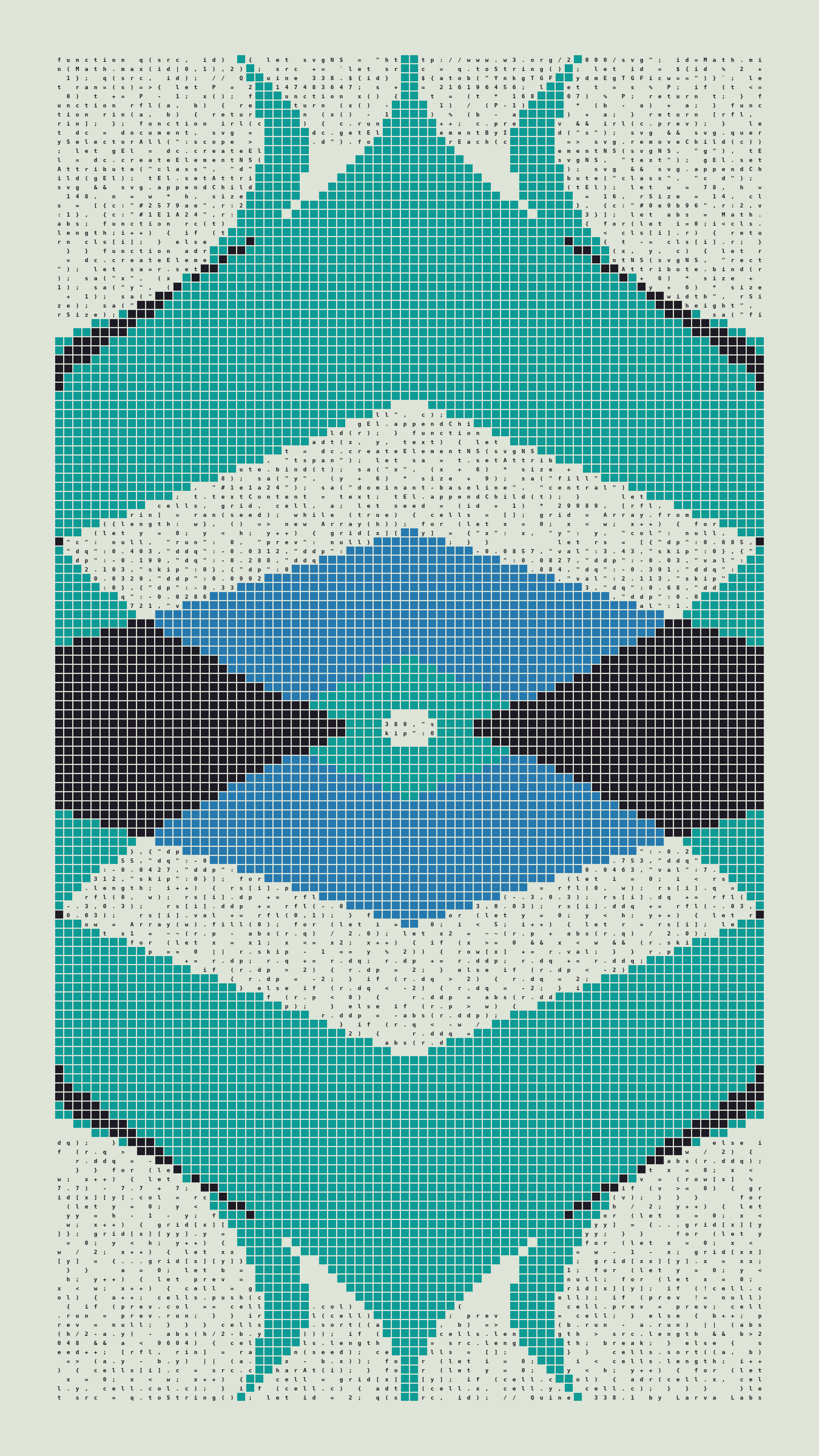 Quine is Larva Labs' contribution to the final Art Blocks Curated series, a project that underscores that all the works on the Art Blocks platform are generated directly from code with no artist supervision. Drawing from the computer science concept of a quine (a computer program that produces a copy of its own source code as its output), the work incorporates its own code into the visuals it creates.