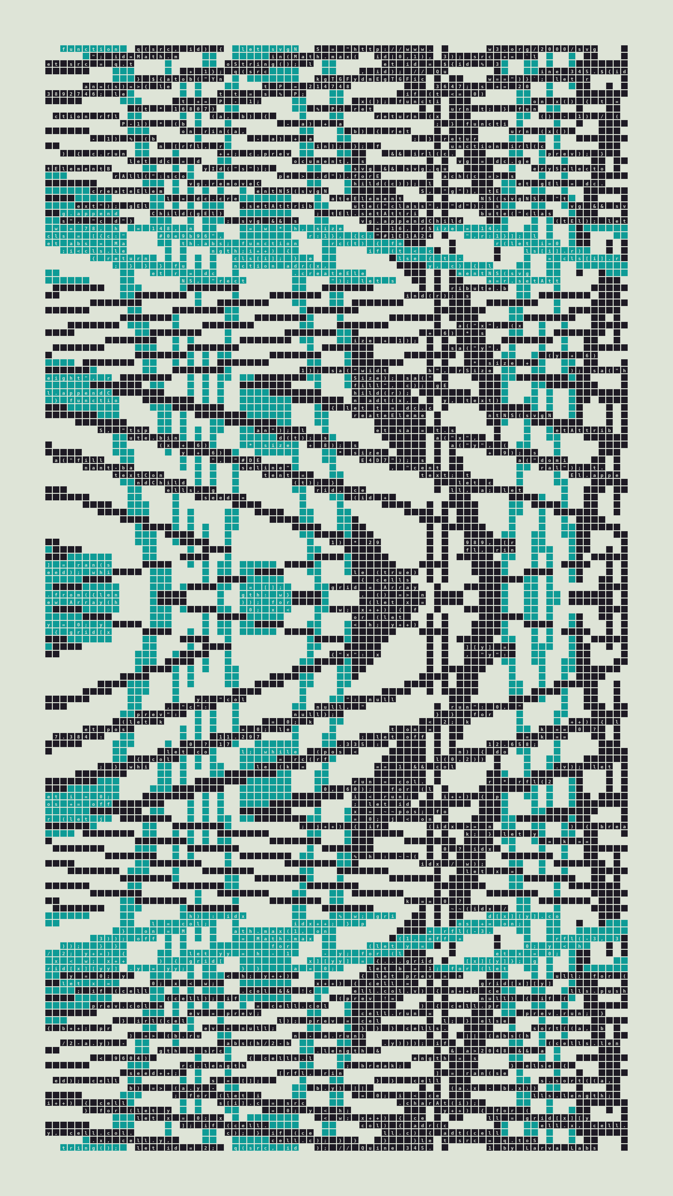 Quine is Larva Labs' contribution to the final Art Blocks Curated series, a project that underscores that all the works on the Art Blocks platform are generated directly from code with no artist supervision. Drawing from the computer science concept of a quine (a computer program that produces a copy of its own source code as its output), the work incorporates its own code into the visuals it creates.