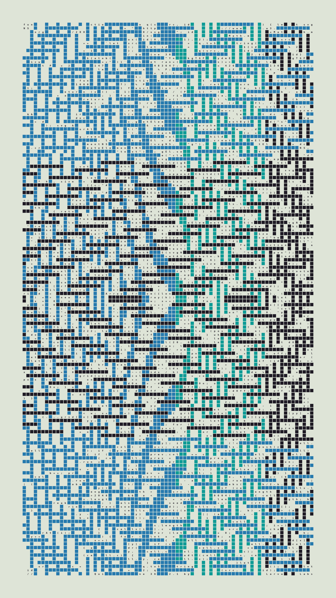 Quine is Larva Labs' contribution to the final Art Blocks Curated series, a project that underscores that all the works on the Art Blocks platform are generated directly from code with no artist supervision. Drawing from the computer science concept of a quine (a computer program that produces a copy of its own source code as its output), the work incorporates its own code into the visuals it creates.