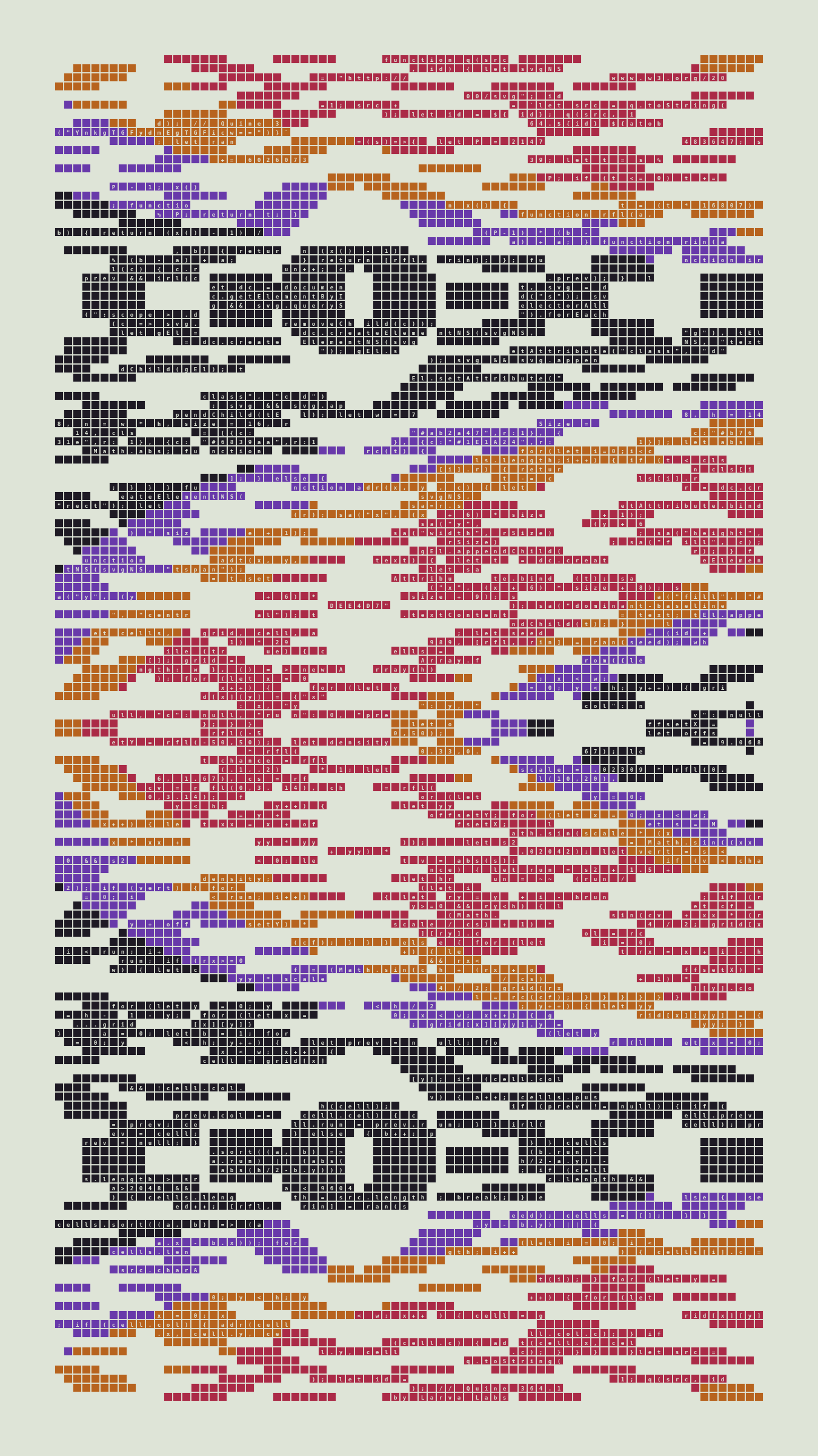 Quine is Larva Labs' contribution to the final Art Blocks Curated series, a project that underscores that all the works on the Art Blocks platform are generated directly from code with no artist supervision. Drawing from the computer science concept of a quine (a computer program that produces a copy of its own source code as its output), the work incorporates its own code into the visuals it creates.