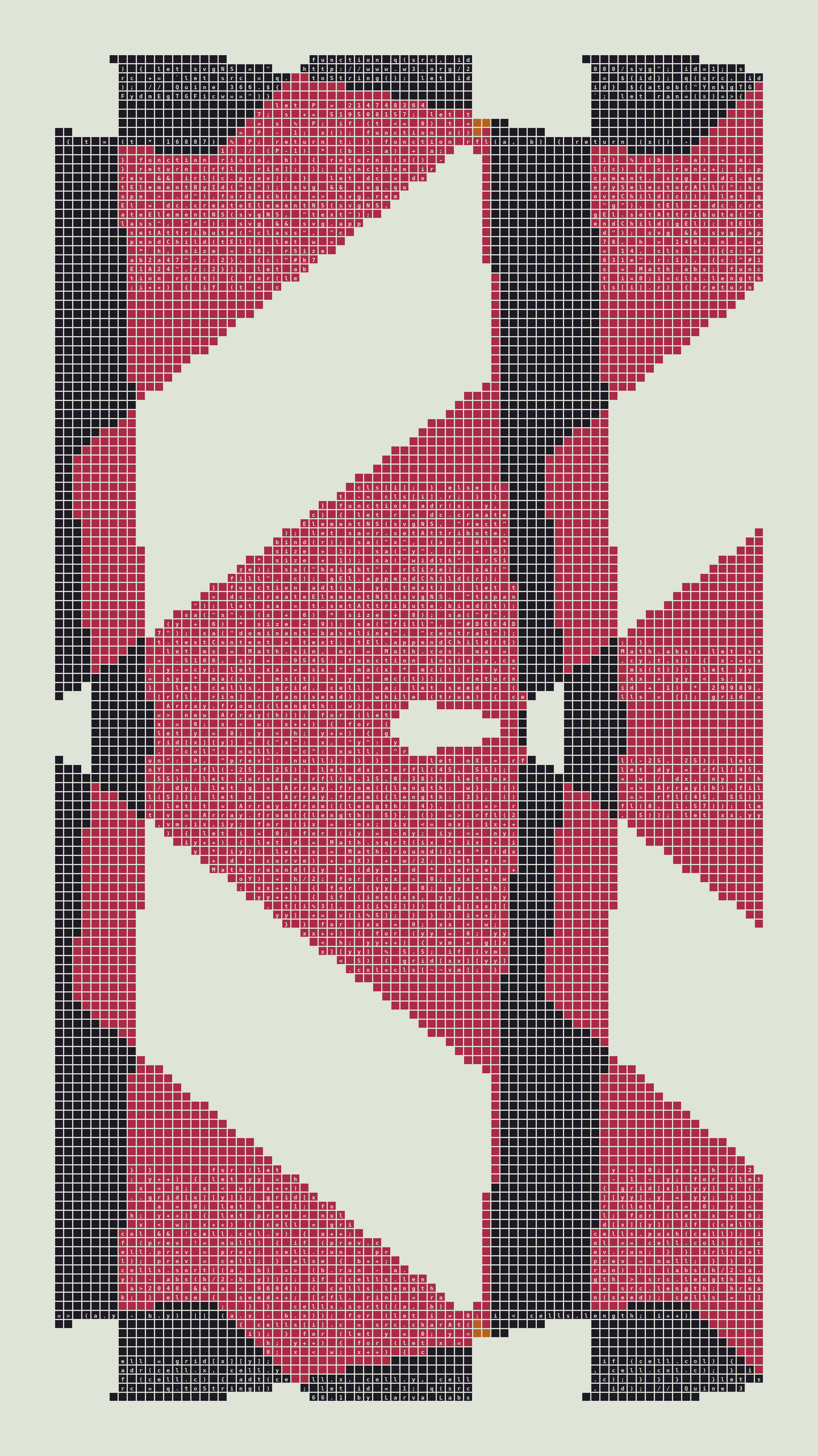 Quine is Larva Labs' contribution to the final Art Blocks Curated series, a project that underscores that all the works on the Art Blocks platform are generated directly from code with no artist supervision. Drawing from the computer science concept of a quine (a computer program that produces a copy of its own source code as its output), the work incorporates its own code into the visuals it creates.
