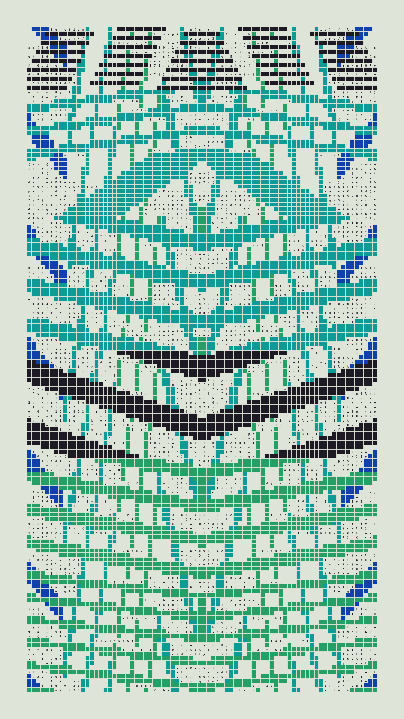 Quine is Larva Labs' contribution to the final Art Blocks Curated series, a project that underscores that all the works on the Art Blocks platform are generated directly from code with no artist supervision. Drawing from the computer science concept of a quine (a computer program that produces a copy of its own source code as its output), the work incorporates its own code into the visuals it creates.
