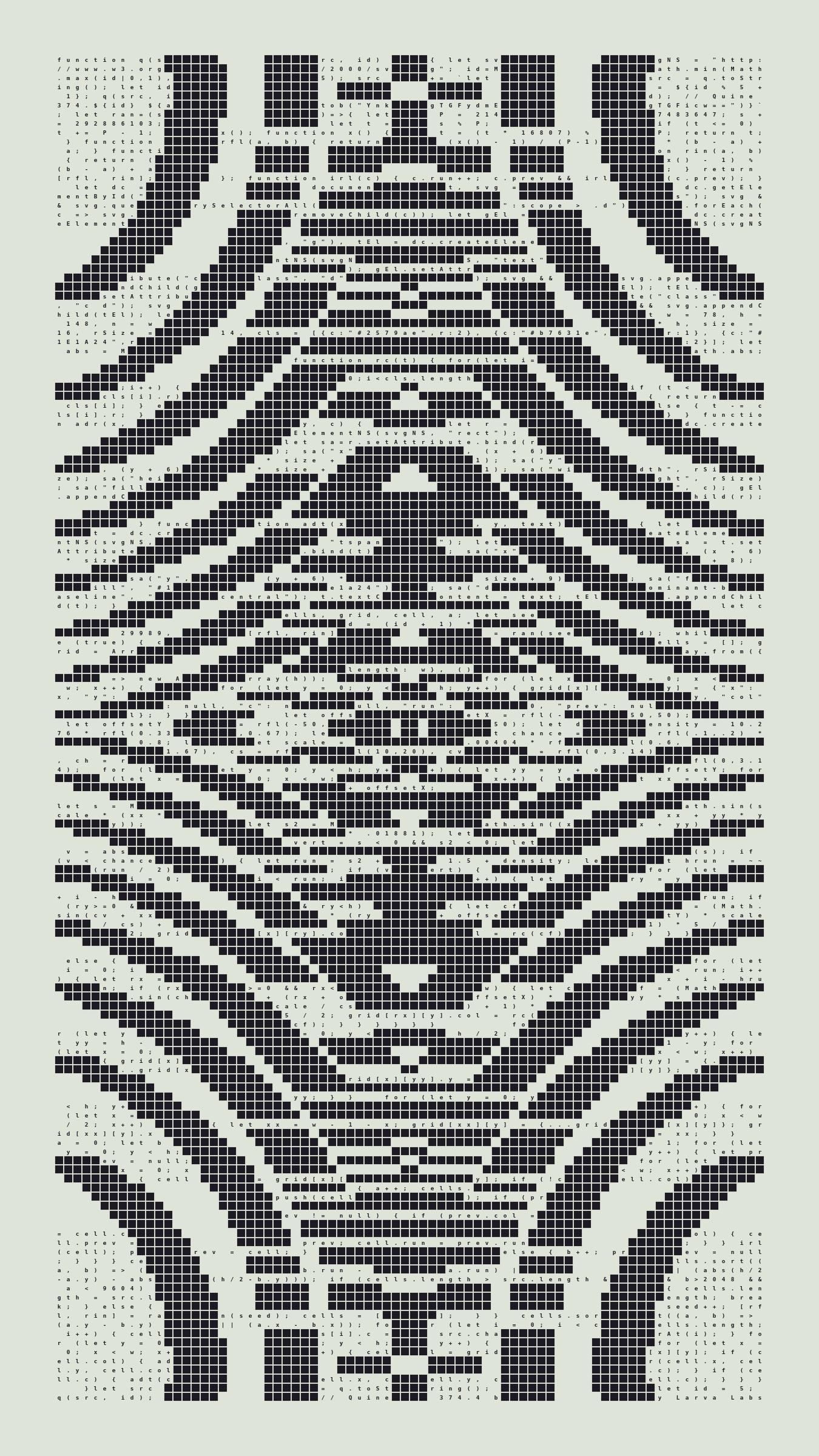 As opposed to creating the artwork directly, the main generator constructs a much smaller, specialized program that produces the visual output, including a layout of its own source code into the work, as well as the mechanism to reproduce itself. In this way, Quines are both program listings and artworks.