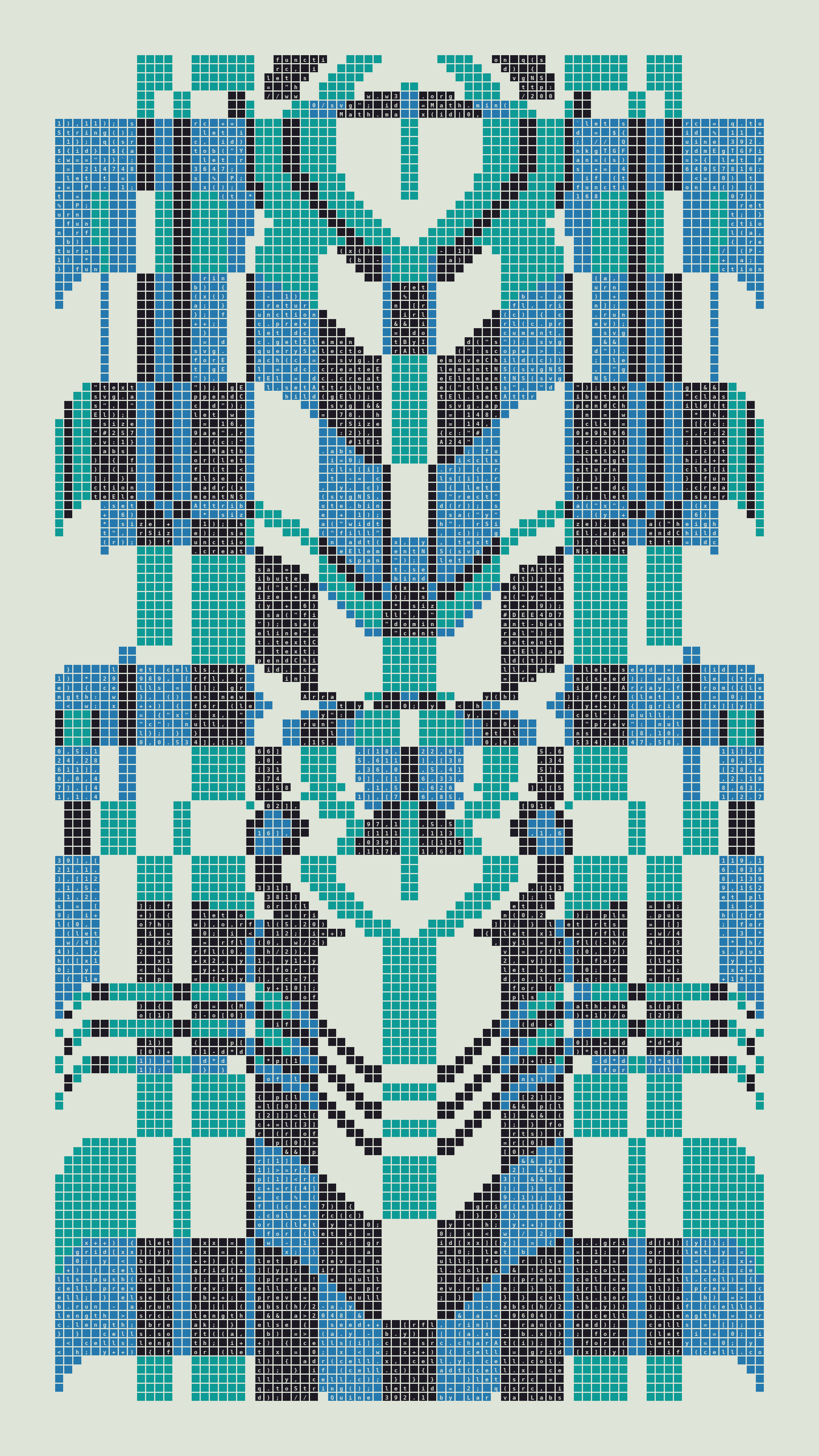 Quine is Larva Labs' contribution to the final Art Blocks Curated series, a project that underscores that all the works on the Art Blocks platform are generated directly from code with no artist supervision. Drawing from the computer science concept of a quine (a computer program that produces a copy of its own source code as its output), the work incorporates its own code into the visuals it creates.