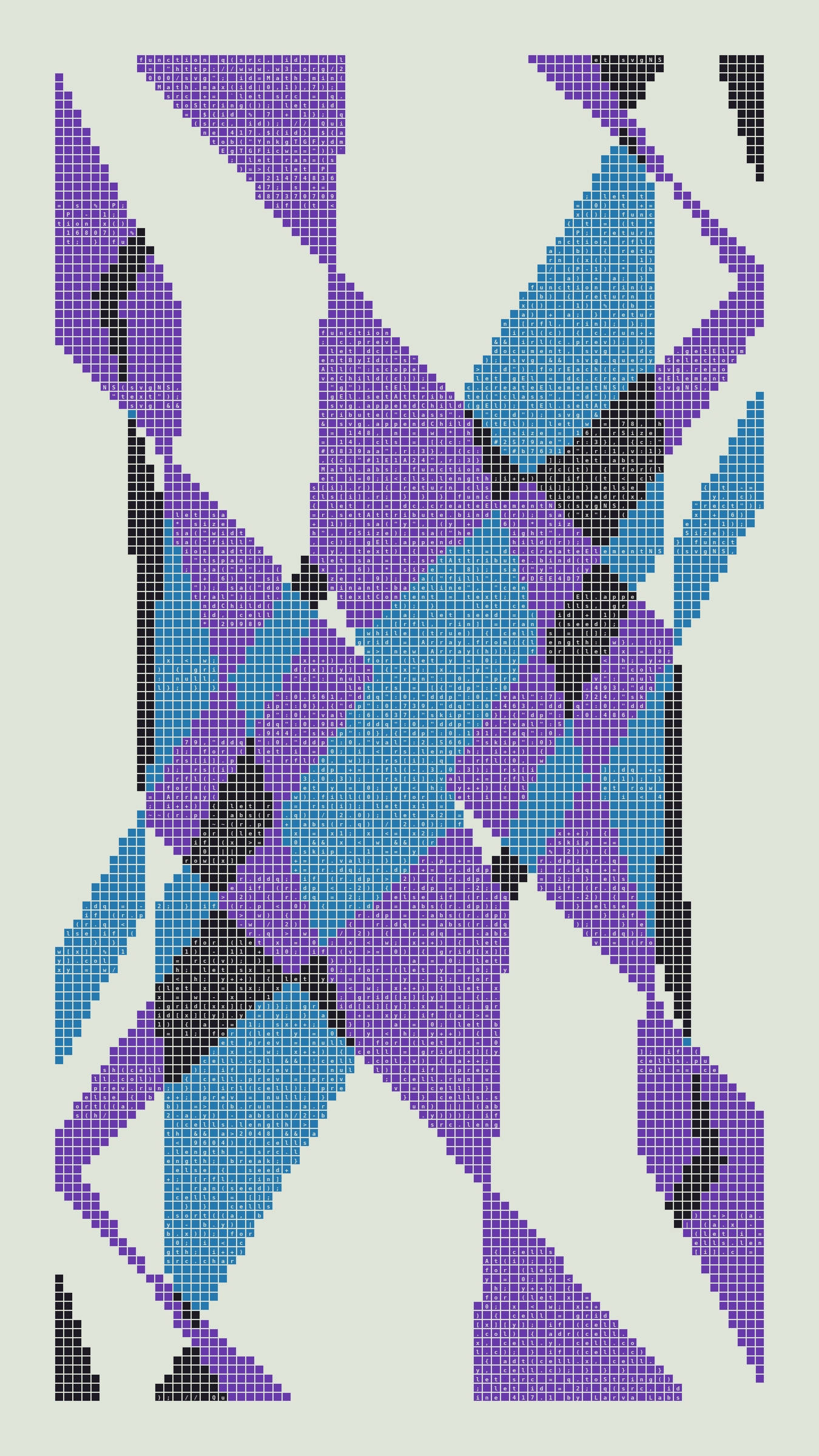 As opposed to creating the artwork directly, the main generator constructs a much smaller, specialized program that produces the visual output, including a layout of its own source code into the work, as well as the mechanism to reproduce itself. In this way, Quines are both program listings and artworks.