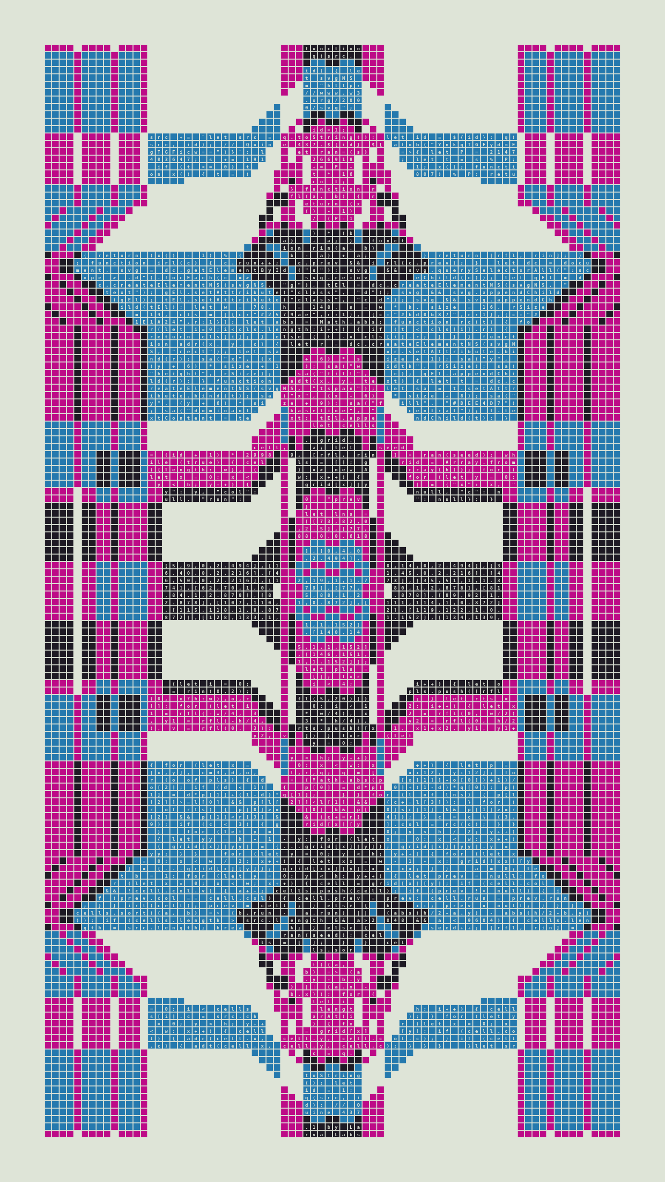 As opposed to creating the artwork directly, the main generator constructs a much smaller, specialized program that produces the visual output, including a layout of its own source code into the work, as well as the mechanism to reproduce itself. In this way, Quines are both program listings and artworks.