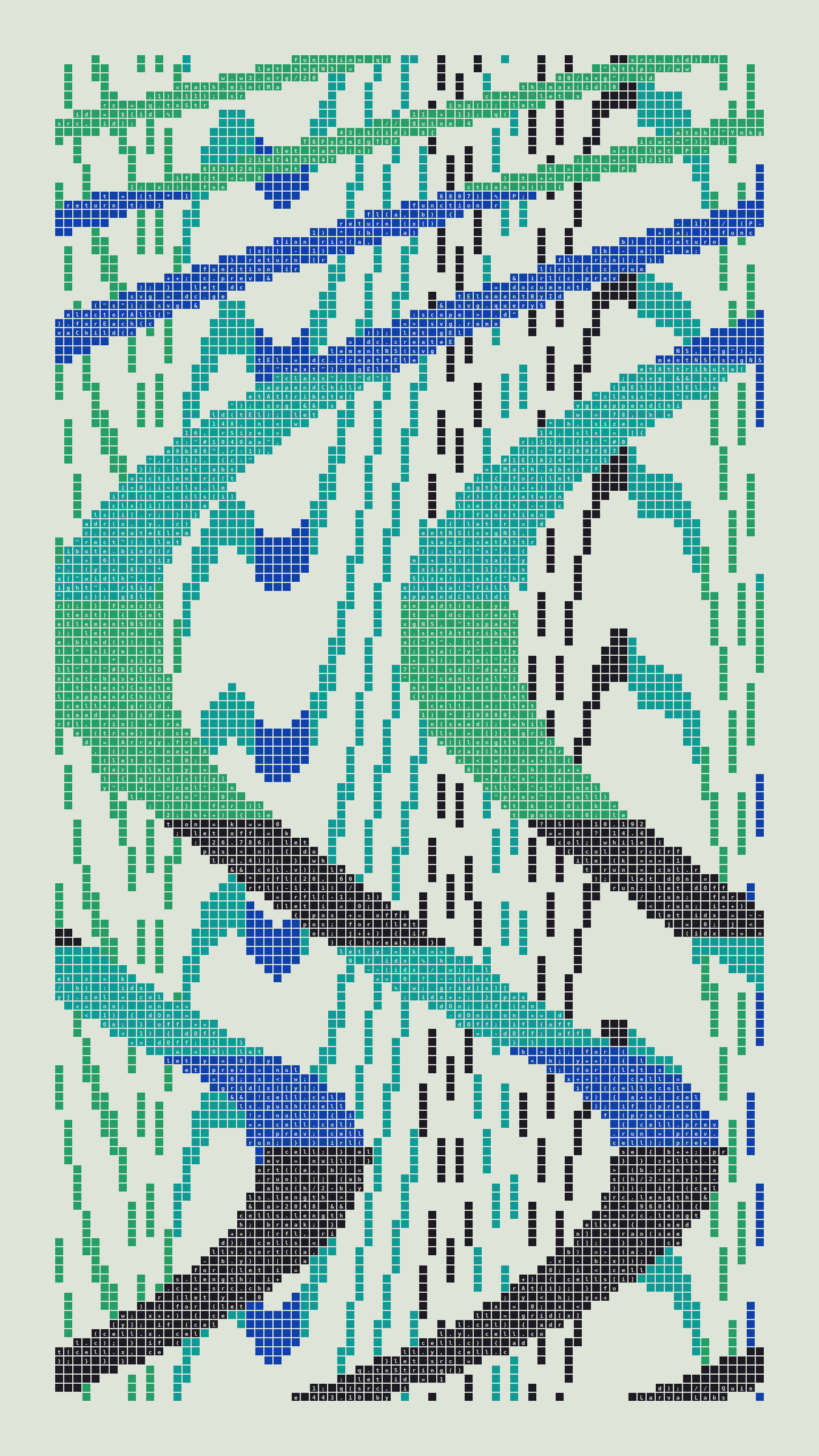 Quine is Larva Labs' contribution to the final Art Blocks Curated series, a project that underscores that all the works on the Art Blocks platform are generated directly from code with no artist supervision. Drawing from the computer science concept of a quine (a computer program that produces a copy of its own source code as its output), the work incorporates its own code into the visuals it creates.