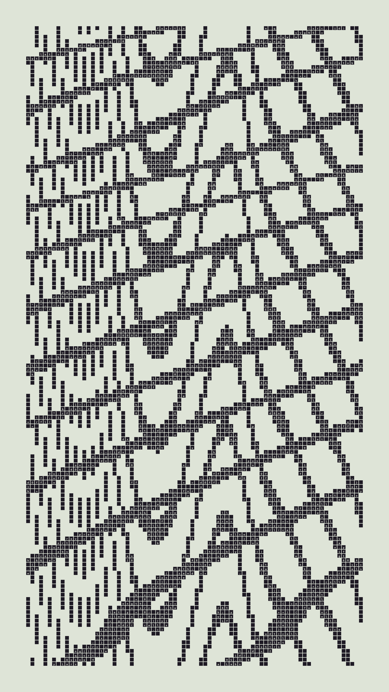 As opposed to creating the artwork directly, the main generator constructs a much smaller, specialized program that produces the visual output, including a layout of its own source code into the work, as well as the mechanism to reproduce itself. In this way, Quines are both program listings and artworks.