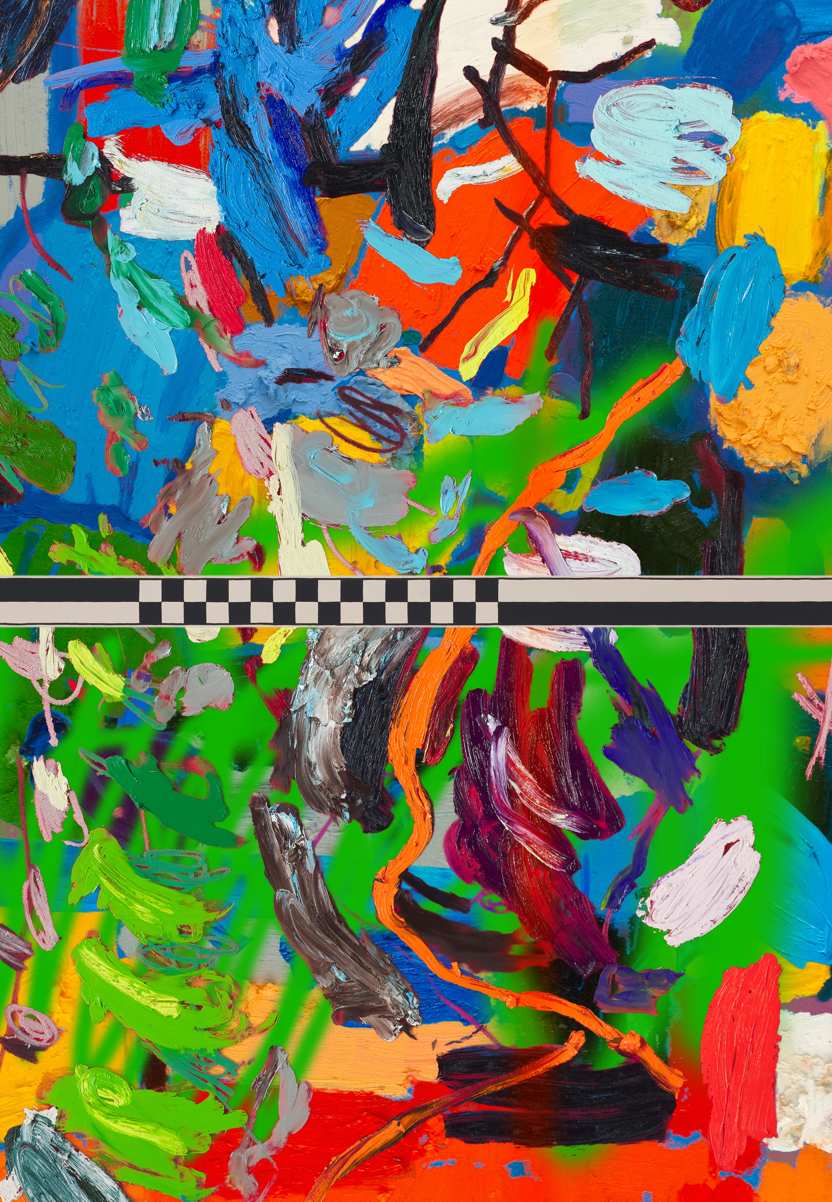 Shockline marks the debut of Horowitz’s digital paintings — an electrified translation of his physical practice into digital form for the first time. These hybrid works combine oil paintings, drawings, and customized checkered registers — adapted from archaeological scales and reimagined as recurring devices in his practice — with scanned and photographed material and virtual brushwork. In digital space, the compositions achieve an almost impossible possible, moving with a speed and fluidity resistant to physical media. They radiate propulsion, urging the viewer forward, while extending Horowitz’s long-standing interest in cross-media translation and retaining the improvisational edge and conceptual wit that have defined his work from hCoin in 2015 to his Nouns DAO–funded film.