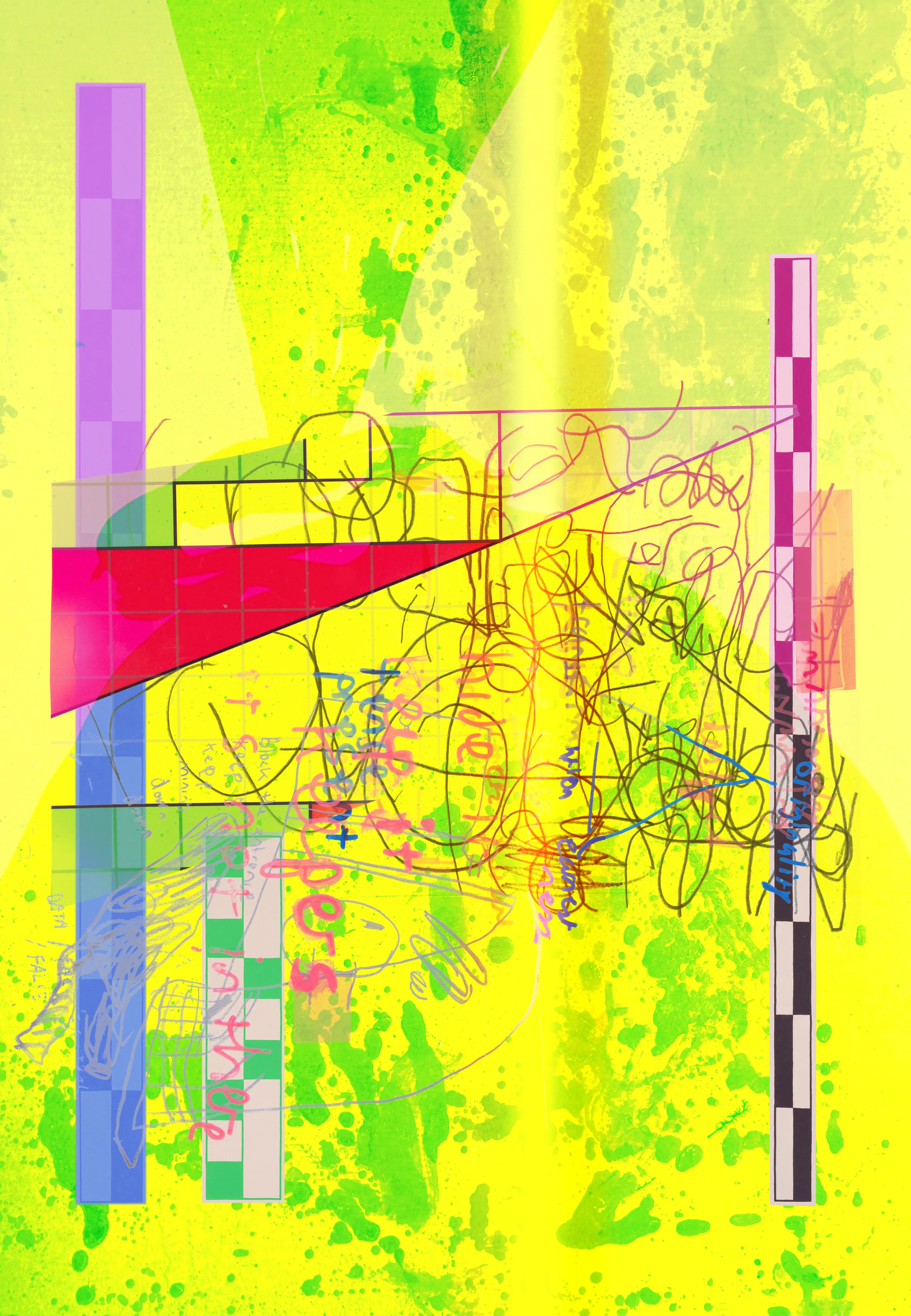 Shockline marks the debut of Horowitz’s digital paintings — an electrified translation of his physical practice into digital form for the first time. These hybrid works combine oil paintings, drawings, and customized checkered registers — adapted from archaeological scales and reimagined as recurring devices in his practice — with scanned and photographed material and virtual brushwork. In digital space, the compositions achieve an almost impossible possible, moving with a speed and fluidity resistant to physical media. They radiate propulsion, urging the viewer forward, while extending Horowitz’s long-standing interest in cross-media translation and retaining the improvisational edge and conceptual wit that have defined his work from hCoin in 2015 to his Nouns DAO–funded film.