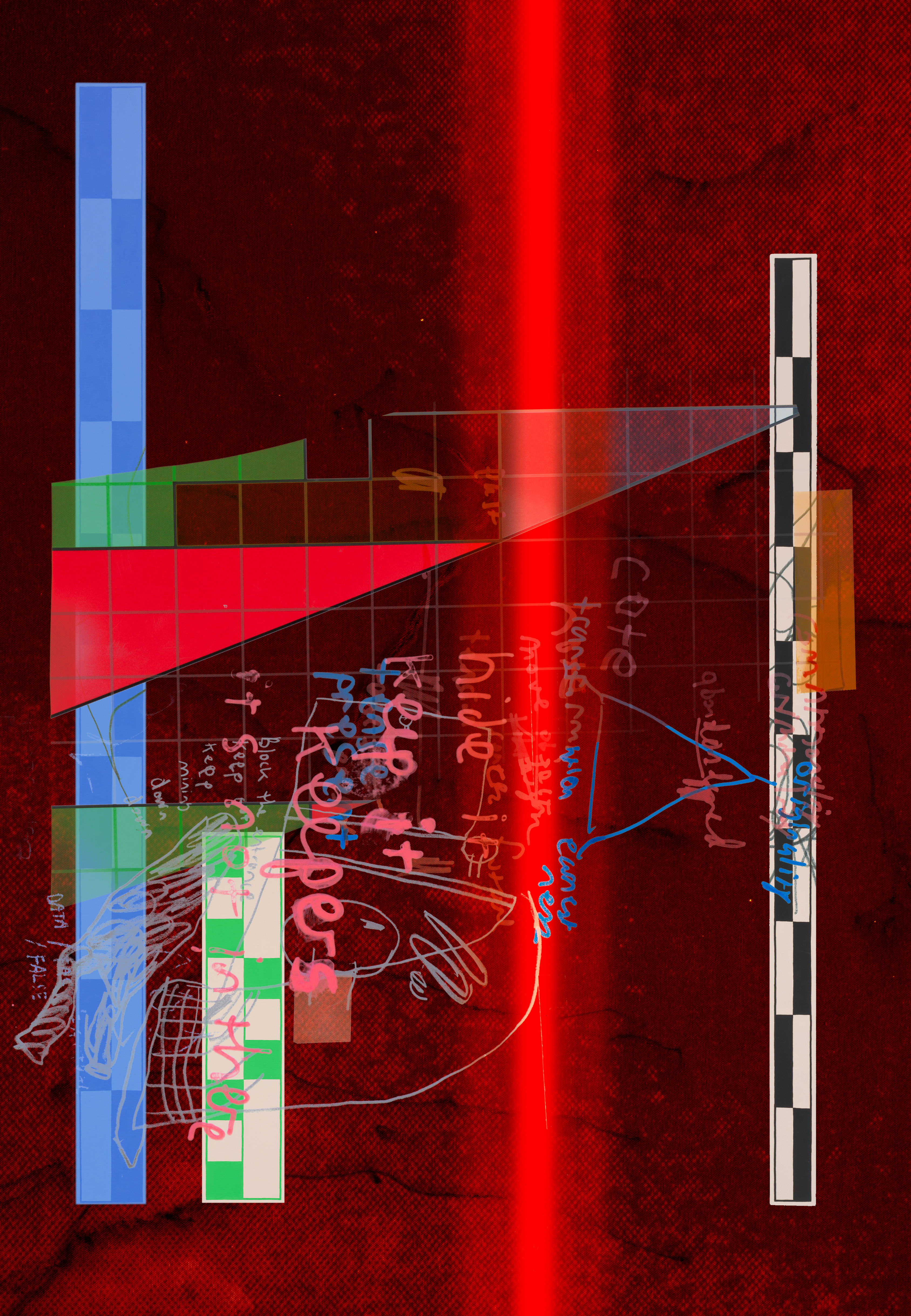 Shockline marks the debut of Horowitz’s digital paintings — an electrified translation of his physical practice into digital form for the first time. These hybrid works combine oil paintings, drawings, and customized checkered registers — adapted from archaeological scales and reimagined as recurring devices in his practice — with scanned and photographed material and virtual brushwork. In digital space, the compositions achieve an almost impossible possible, moving with a speed and fluidity resistant to physical media. They radiate propulsion, urging the viewer forward, while extending Horowitz’s long-standing interest in cross-media translation and retaining the improvisational edge and conceptual wit that have defined his work from hCoin in 2015 to his Nouns DAO–funded film.