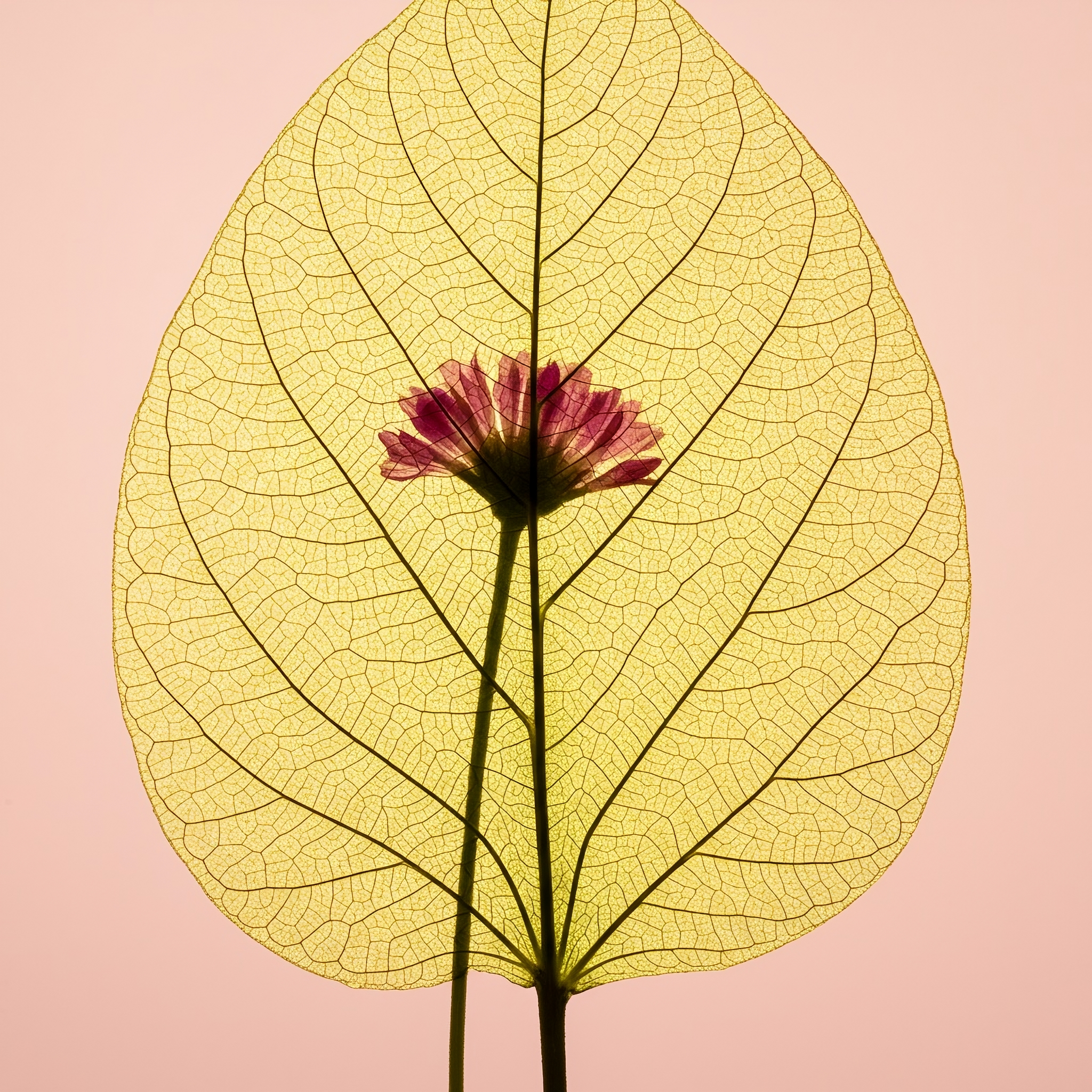 I dreamt I was tracing the lines on an ancient map, a world contained within a single leaf. The veins were infinite, parallel roads of chartreuse light, all converging on a great central highway that split the world in two. It was a silent, verdant landscape, pulsing with a life I could feel but not see. Then, beyond the translucent edge of my world, a soft nebula bloomed. A single, pink blossom unfurled from its delicate stem, a distant star of impossible color against the pale, endless blush of the morning sky, whispering a secret I would forget upon waking.
