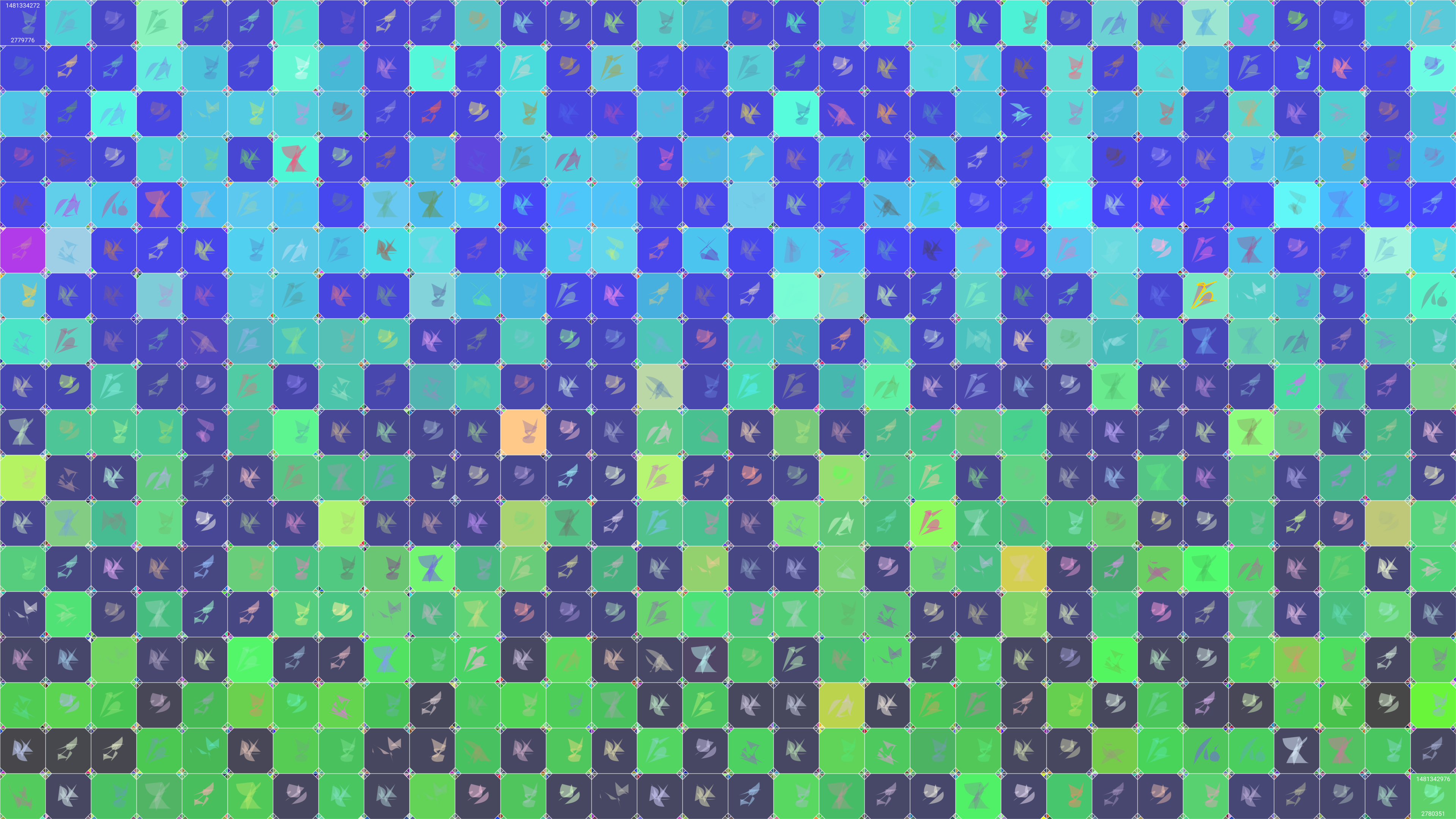 This is painting #4826. Its full digital image (7680x4320 pixels) can be downloaded free of charge by the token owner at https://www.cryptoarte.io/paintings/4826. The authenticity of this digital image can be independently verified by calculating its SHA256 and comparing it to the value returned when invoking tokenIdToHash(4826) on the CryptoArte Ethereum contract at 0xbace7e22f06554339911a03b8e0ae28203da9598 and converting it to hexadecimal. Additionally, the hexadecimal hash value can also be retrieved from the token's metadata. This painting represents block numbers 2779776 through 2780351, and the time period starting on 2016-12-10 01:44:32 UTC and ending on 2016-12-10 04:09:36 UTC.