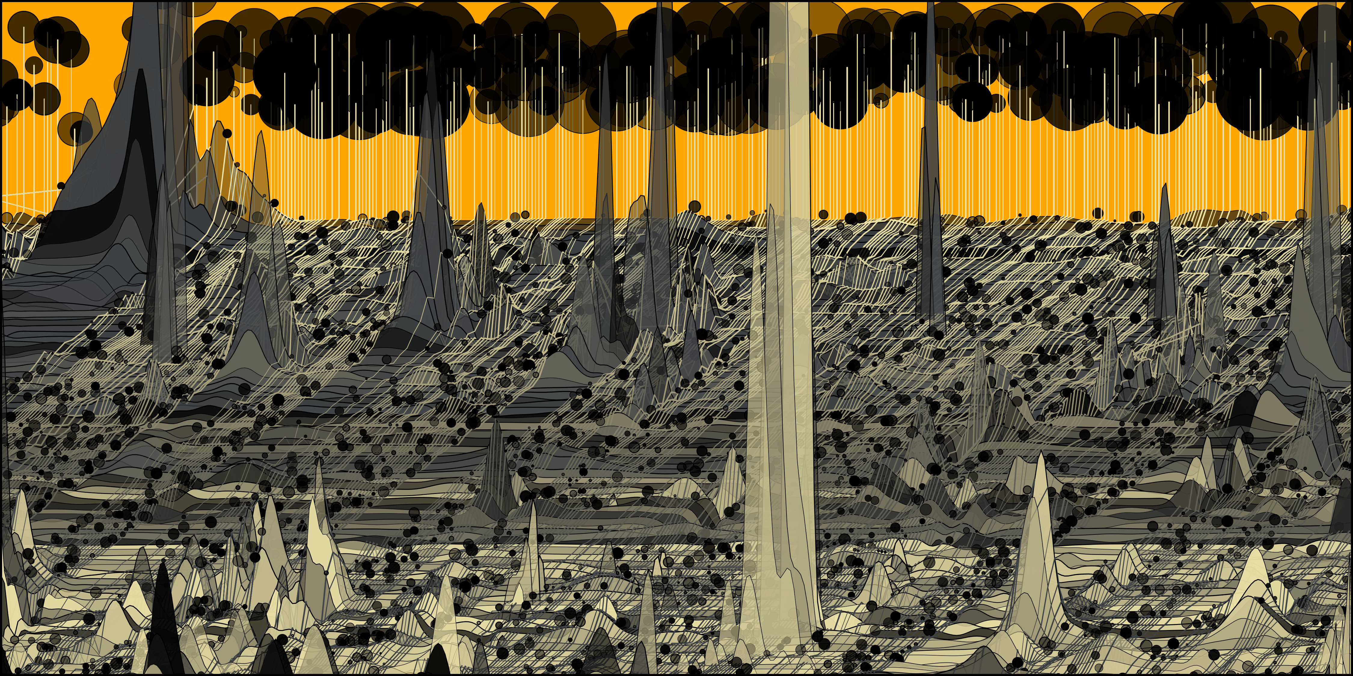 Super User is a series of generative artworks that include abstract pyroscapes, shadowy tunnels, shimmering surfaces, and golden moiré patterns with characteristically dark themes for Vaden. These images represent a world full of beauty and horror, created with statistical tools commonly used for scientific research. Carefully developed algorithms were used to create unique artwork each time that they were run, with output curated by the artist.