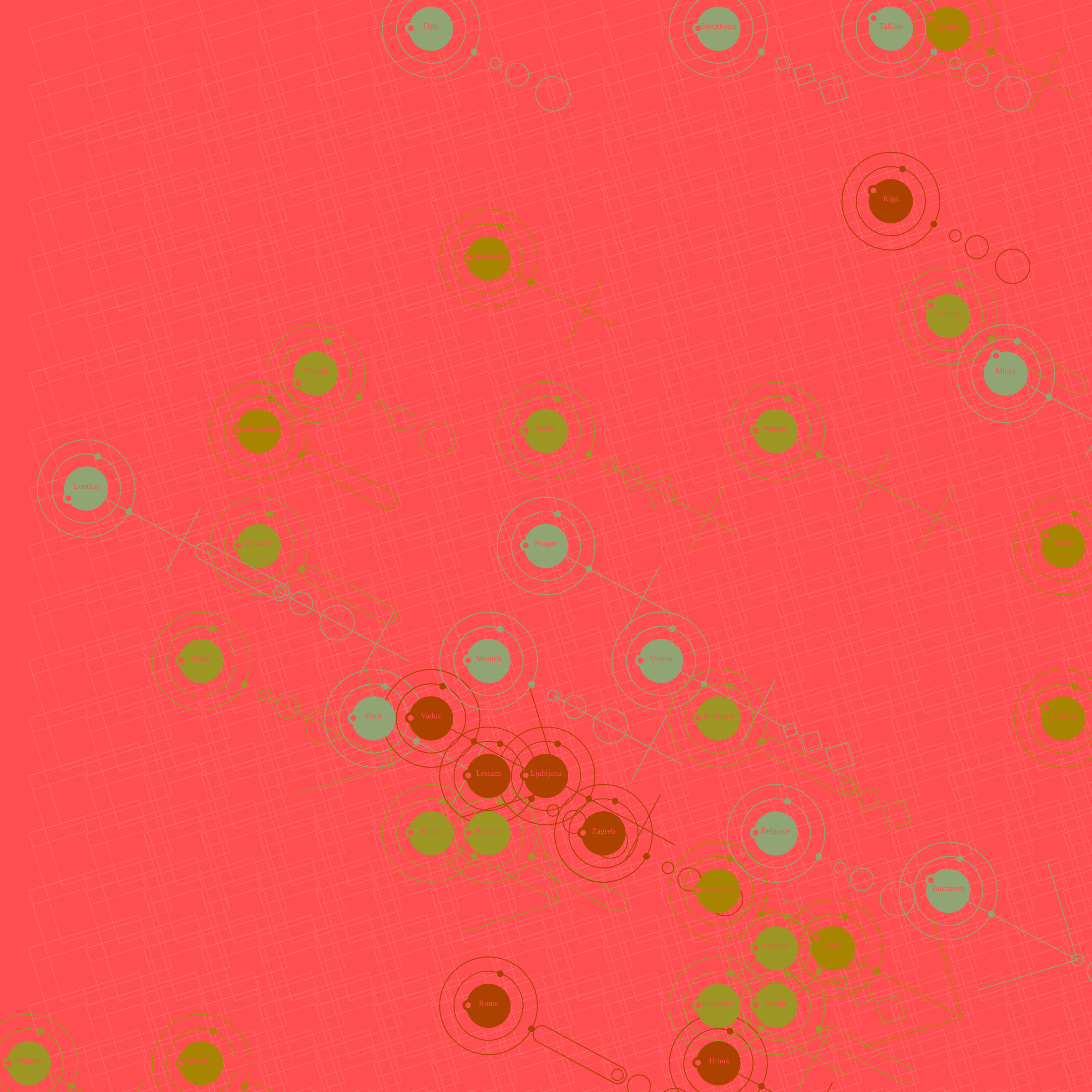 Project Description: When does a work stop being the representation of our world and become art? Can we appreciate a work of art without measuring it with our space-time parameters? In Time Atlas 🌐 the link with our Earth shaped over millennia through the urbanization process is explicit. Time Atlas 🌐 uses geo-referenced city data intensively and displays it randomly in geographic areas, showing the current time of each city, whether it is currently exposed to the sun, at night or at dusk by changing the reference color palette . There are over 200 cities collected in its monumental internal archive, each with its own latitude and longitude values, UTC and DST time, number of inhabitants. Each instance shows a square of our land, the cities arrange you in a grid that respects the distances in proportion. The background rotates to the current value of seconds which is the same all over the world. It is potentially composed of 8 geometric elements that can be present with different probabilities. City clocks can be of 4 different shapes; the length of the pendulum that rotates with the time of the seconds is composed of 5 elements that combine randomly but the length of the pendulum corresponds to the number of inhabitants of that city. The elements of the composition can be turned off and on again thanks to these keys: [c] toggle cities [w] toggle watches [b] toggle background Finally, there is the Written Circles variation. It takes up a past work of mine with the same title and in my initial idea it had to be the only aspect of Time Atlas 🌐. The salient feature of the Written Circles display is that it does not have a rotating background but, for each city, the crown of minutes is proportional to the number of inhabitants, therefore interesting moiré effects are obtained in superimposition.