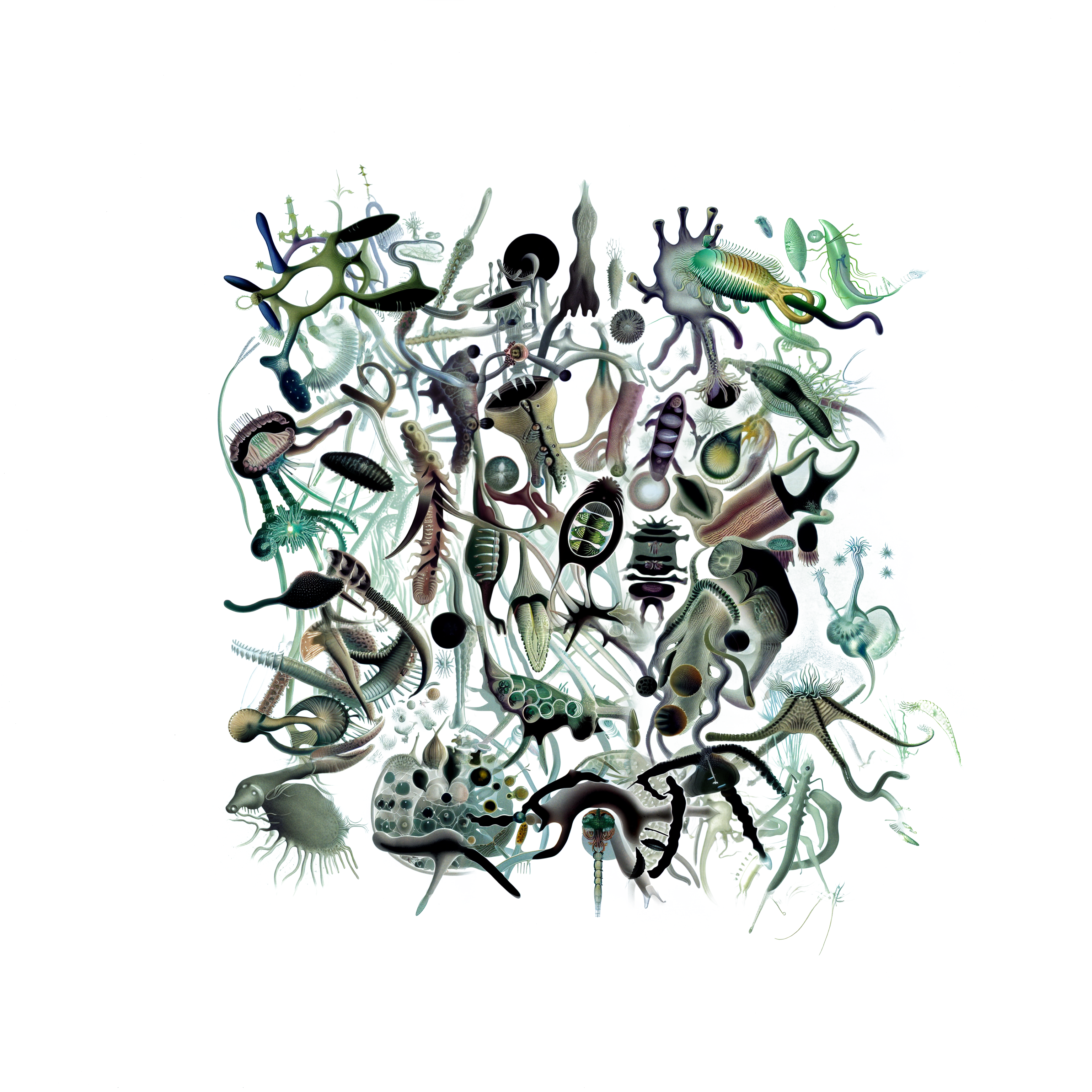 The continuum of what we sample stretches beyond the realm of the fathomable, yet even when we extract but a single drop of water, we find within it entire ecosystems of life and interactions. It's tempting to view each drop as a world, contained beautifully by surface tensions. Yet, when given the chance, even the smallest ecosystem will naturally merge with any other body of liquid, erasing and re-writing the depth and composition of the life within. This series acts as a multitude of samples drawn from the same intertidal zone of artificial life, deceptively singular and delimited, patiently awaiting the chance to diffuse into something greater.