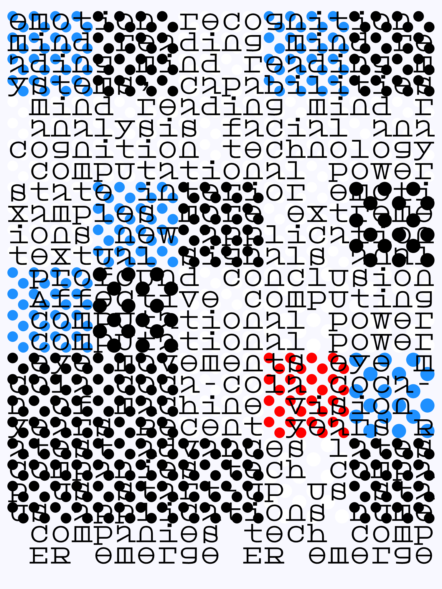 In order to explore this idea, I've chosen a variety of news articles, research papers and presentations on the subjects of emotion, facial recognition and affective computing and analysed them using IBM's NLP Sentiment API. This raw data is then used as content for creating unique generative pieces that play with text and typographic form.