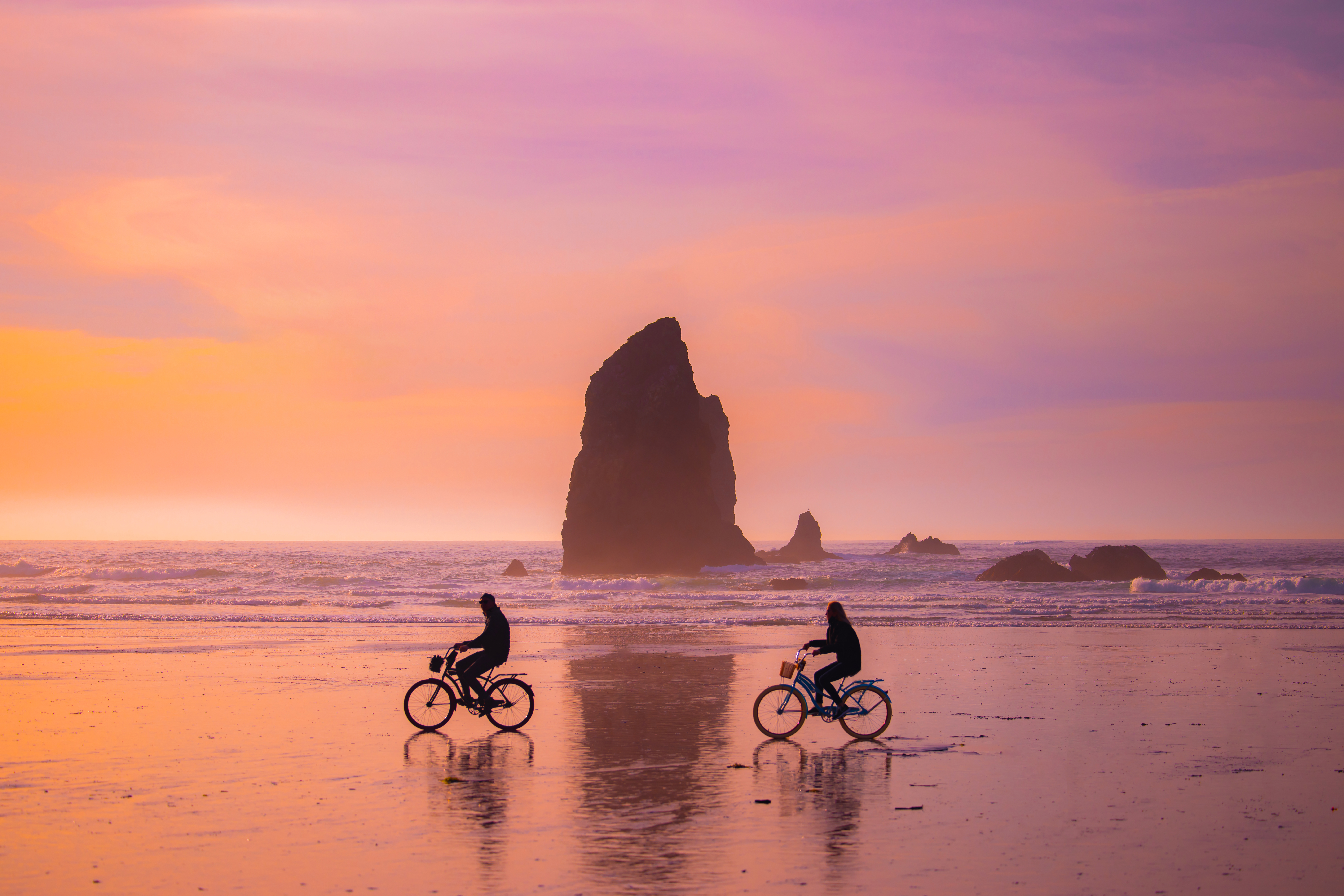 During this particular visit, we experienced a gorgeous, colorful sunset. I was snapping photos of the coastal rocks, called The Needles, when I saw some bikers cruising down the beach. I waited until they were in frame, and fired off some shots. This photo is one of my all time favorites.
