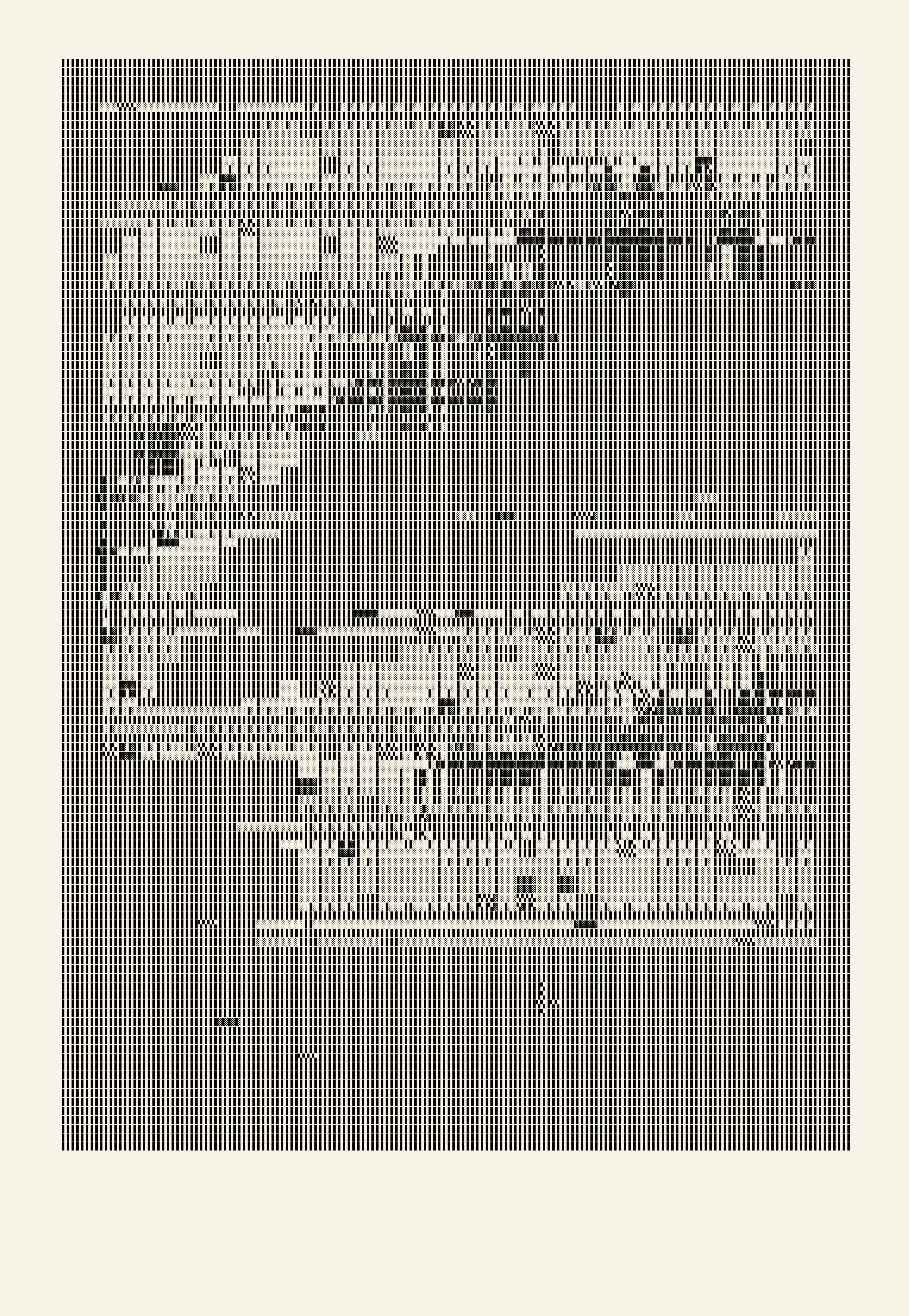 Using solely the Unicode block elements as a base material, the generated patterns evoke a nostalgia for the age of teletype and early dot-matrix printers while simultaneously referencing early computational aesthetics such as arcade games and command-line interfaces. Now no longer tied to their original utility for use in software terminal emulation these special characters, which are today index fossils from the early era of computing, have been transcoded into weave patterns that define larger pictorial systems. Just as there are ancient tapestries depicting scenes from culturally significant events, some outputs of ISO/IEC 10646 recall images of our earliest arcade games with scenes of partly-destroyed fortresses and floating space debris, rockets and asteroids. But among the many permutations of the collection you will also find the traces of cartographic systems, the rubrics of ciphers and the aesthetics of MS DOS's Defrag program.