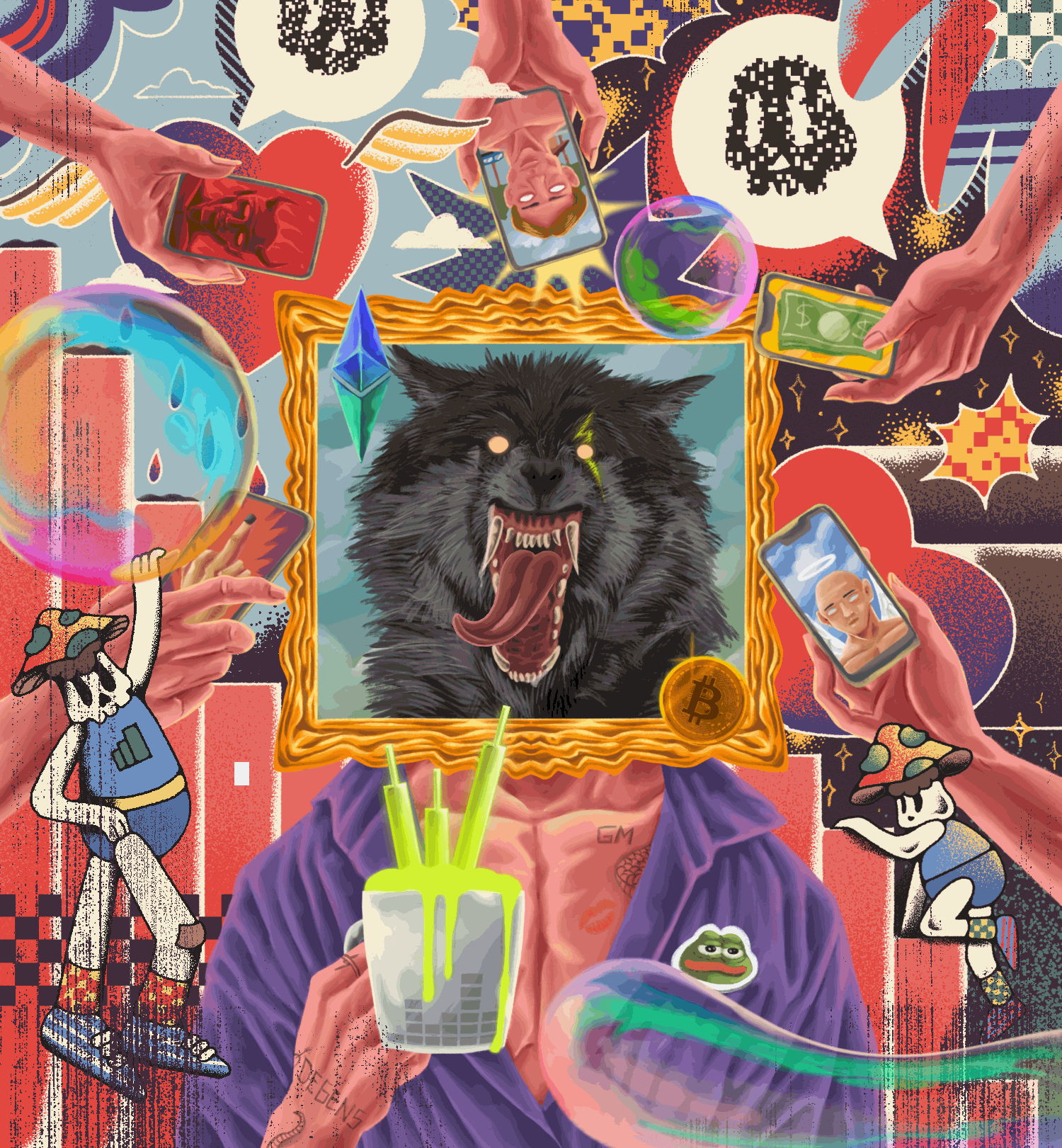 In an age where reflections are crafted by algorithms, the mirror no longer shows who we are; it reacts, consumes, and retaliates. This piece dissects the feedback loop between identity, media, and desire: a world where wolves wear golden frames, pixels mimic prophets, and validation circulates like currency.