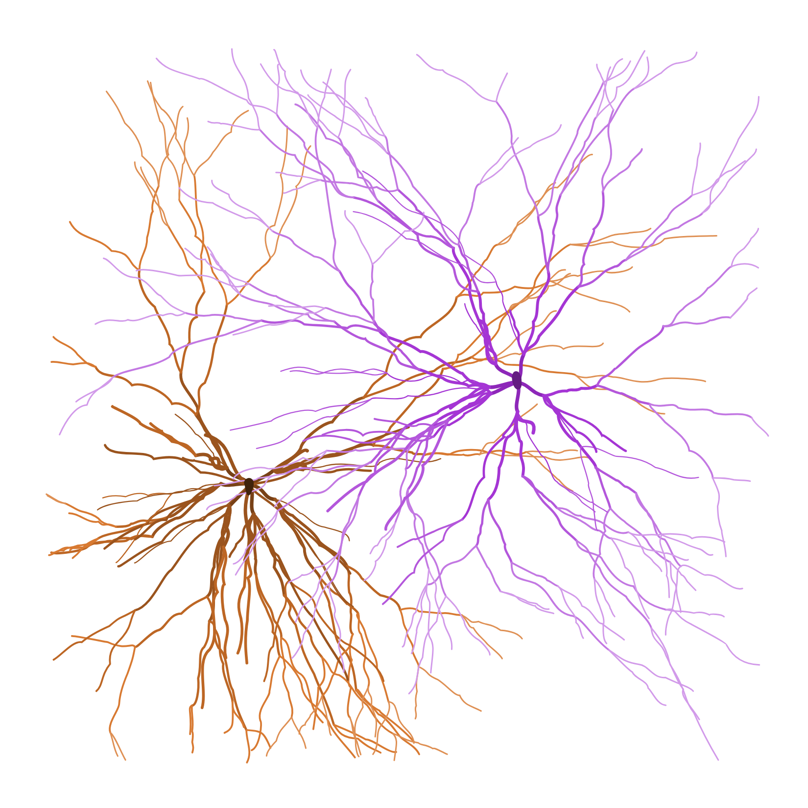 Ghost Forest Seedlings captures the organic growth patterns of a living, underground network of tree roots. The artworks depict a seed or group of seeds growing into an intricate root pattern, or seedling. Eschewing most computer-derived growth patterns, which create geometric and fractal patterning, the algorithm Lin has created generates artworks with growth patterns that are