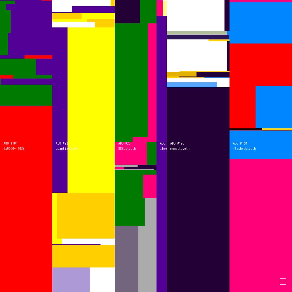 ABO #101 is connected to ABO #22 (owned by quantized.eth), ABO #26 (owned by 888bit.eth), ABO #106 (owned by itme.eth), ABO #108 (owned by mmmatto.eth) and ABO #130 (owned by flashrekt.eth).