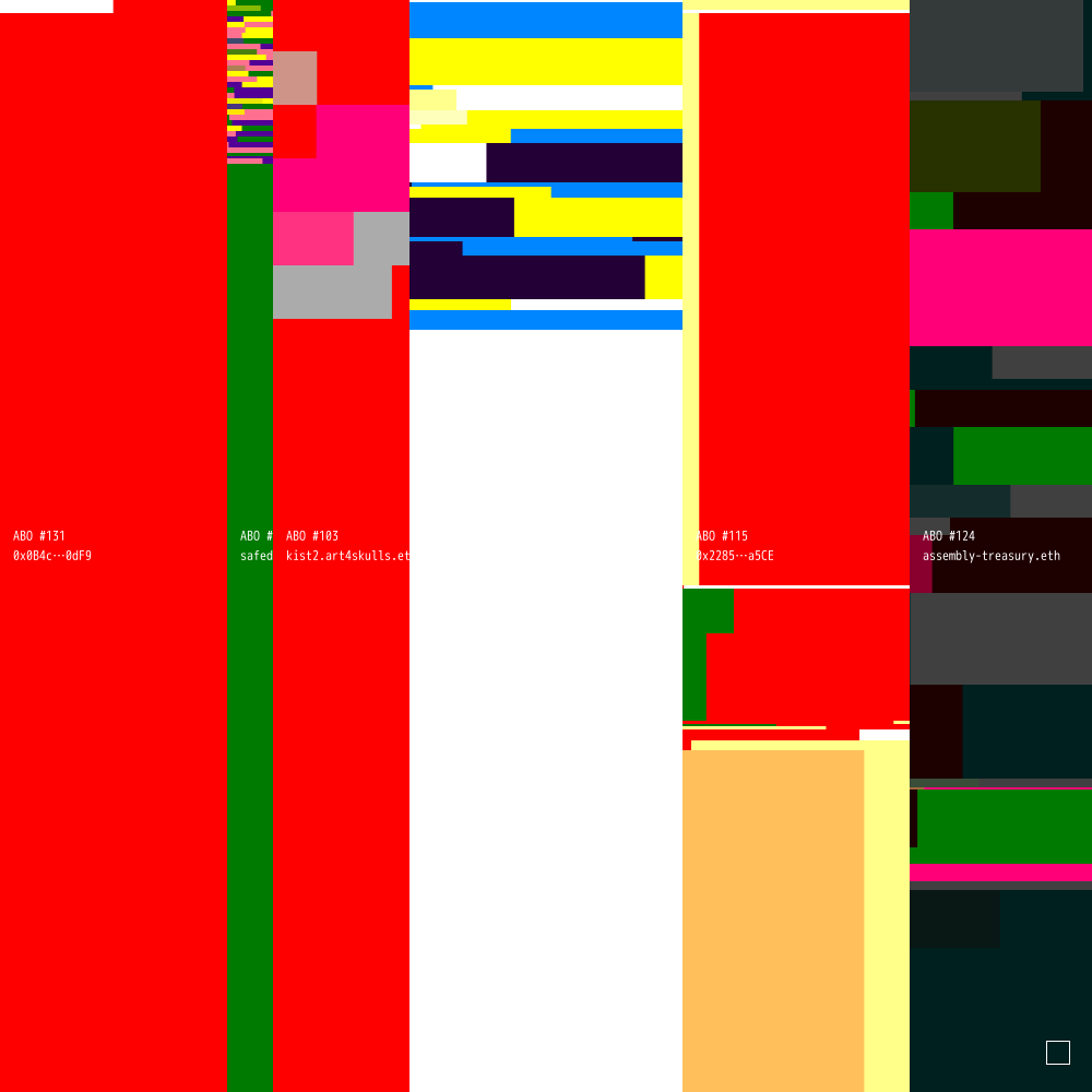 ABO #131 is connected to ABO #74 (owned by safedave.eth), ABO #103 (owned by kist2.art4skulls.eth), ABO #110 (owned by mmmatto.eth), ABO #115 (owned by 0x2285Ec40F3618718EDF88A305fDf4b9fE89ba5CE) and ABO #124 (owned by assembly-treasury.eth).