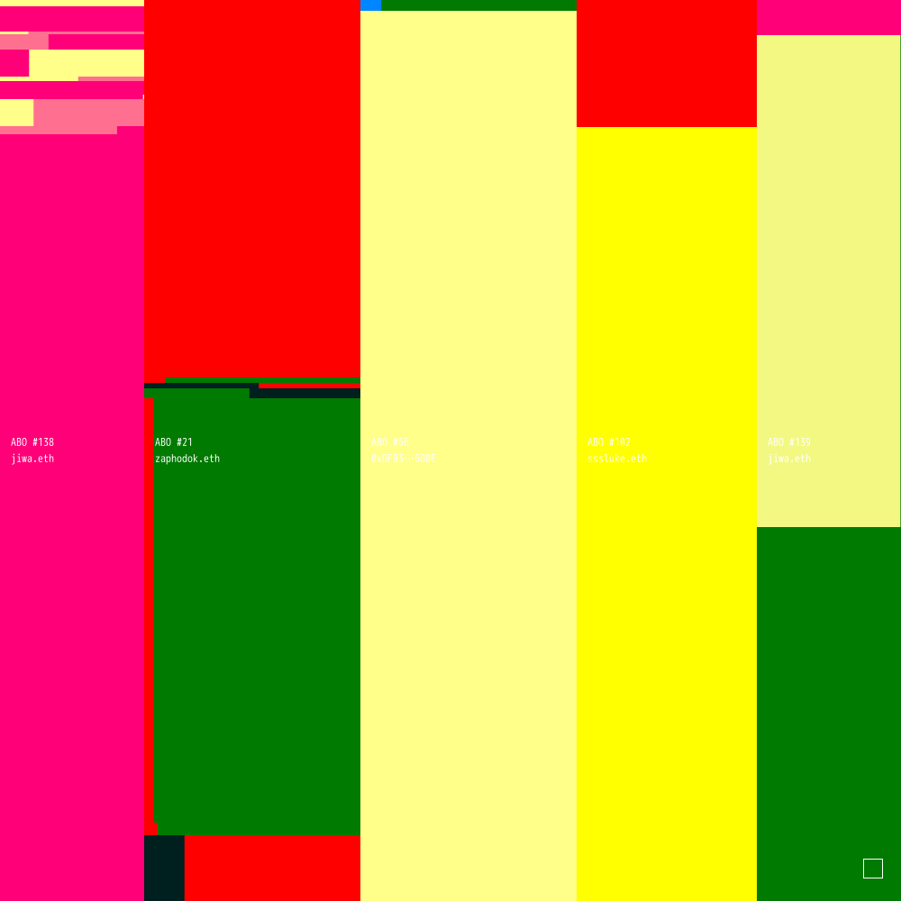 ABO #138 is connected to ABO #21 (owned by zaphodok.eth), ABO #66 (owned by 0xDF9396B3600583c3DC1E67D5C963F0c4E230680E), ABO #102 (owned by sssluke.eth) and ABO #139 (owned by jiwa.eth).